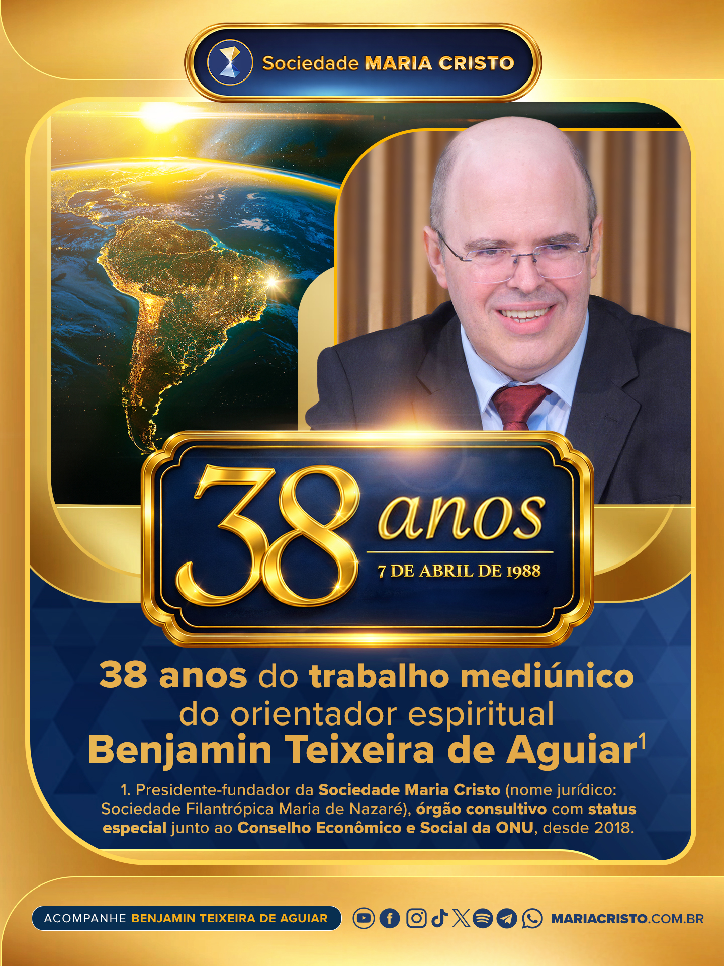38 anos do trabalho mediúnico do orientador espiritual Benjamin Teixeira de Aguiar¹7 de abril de 2026 | Equipe Sociedade Maria Cristo 1. Presidente-fundador da Sociedade Maria Cristo (nome jurídico: Sociedade Filantrópica Maria de Nazaré), órgão consultivo com status especial junto ao Conselho Econômico e Social da ONU, desde 2018.