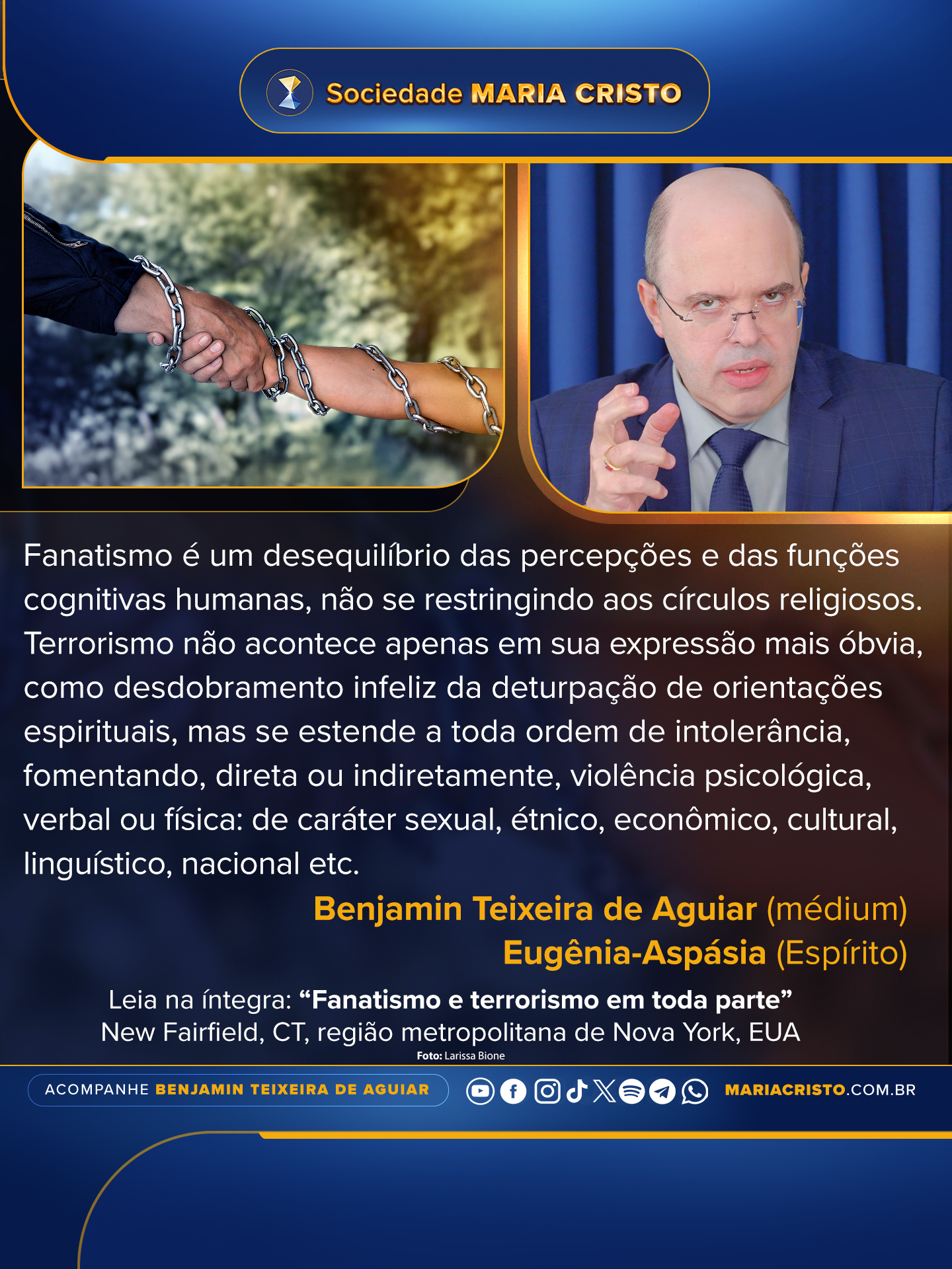 Terrorismo não acontece apenas em sua expressão mais óbvia, como desdobramento infeliz da deturpação de orientações espirituais, mas se estende a toda ordem de intolerância, fomentando, direta ou indiretamente, violência psicológica, verbal ou física: de caráter sexual, étnico, econômico, cultural, linguístico, nacional etc.