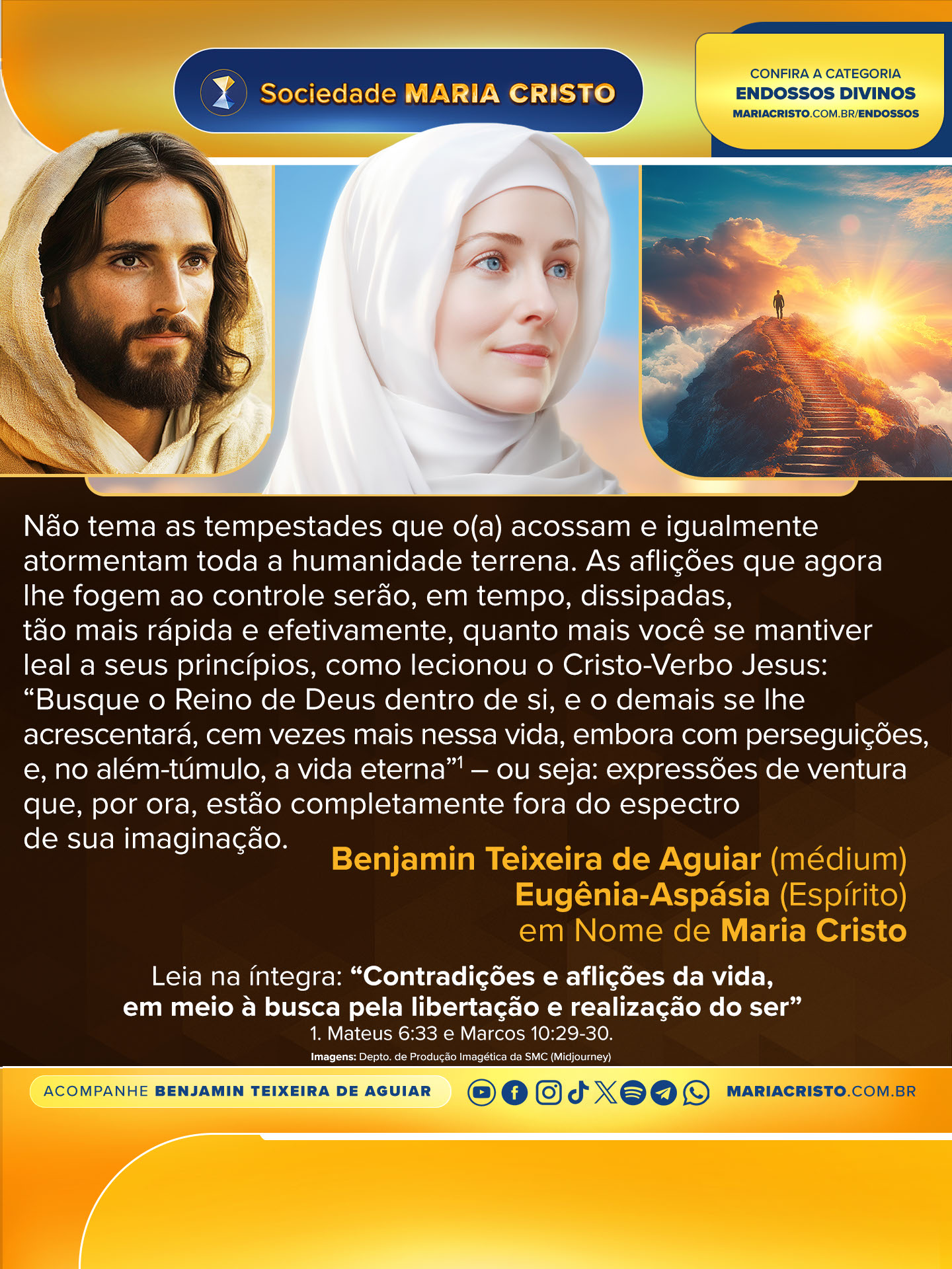 Não tema as tempestades que o(a) acossam e igualmente atormentam toda a humanidade terrena. As aflições que agora lhe fogem ao controle serão, em tempo, dissipadas, tão mais rápida e efetivamente, quanto mais você se mantiver leal a seus princípios, como lecionou o Cristo-Verbo Jesus: “Busque o Reino de Deus dentro de si, e o demais se lhe acrescentará, cem vezes mais nessa vida, embora com perseguições, e, no além-túmulo, a vida eterna”¹ – ou seja: expressões de ventura que, por ora, estão completamente fora do espectro de sua imaginação.