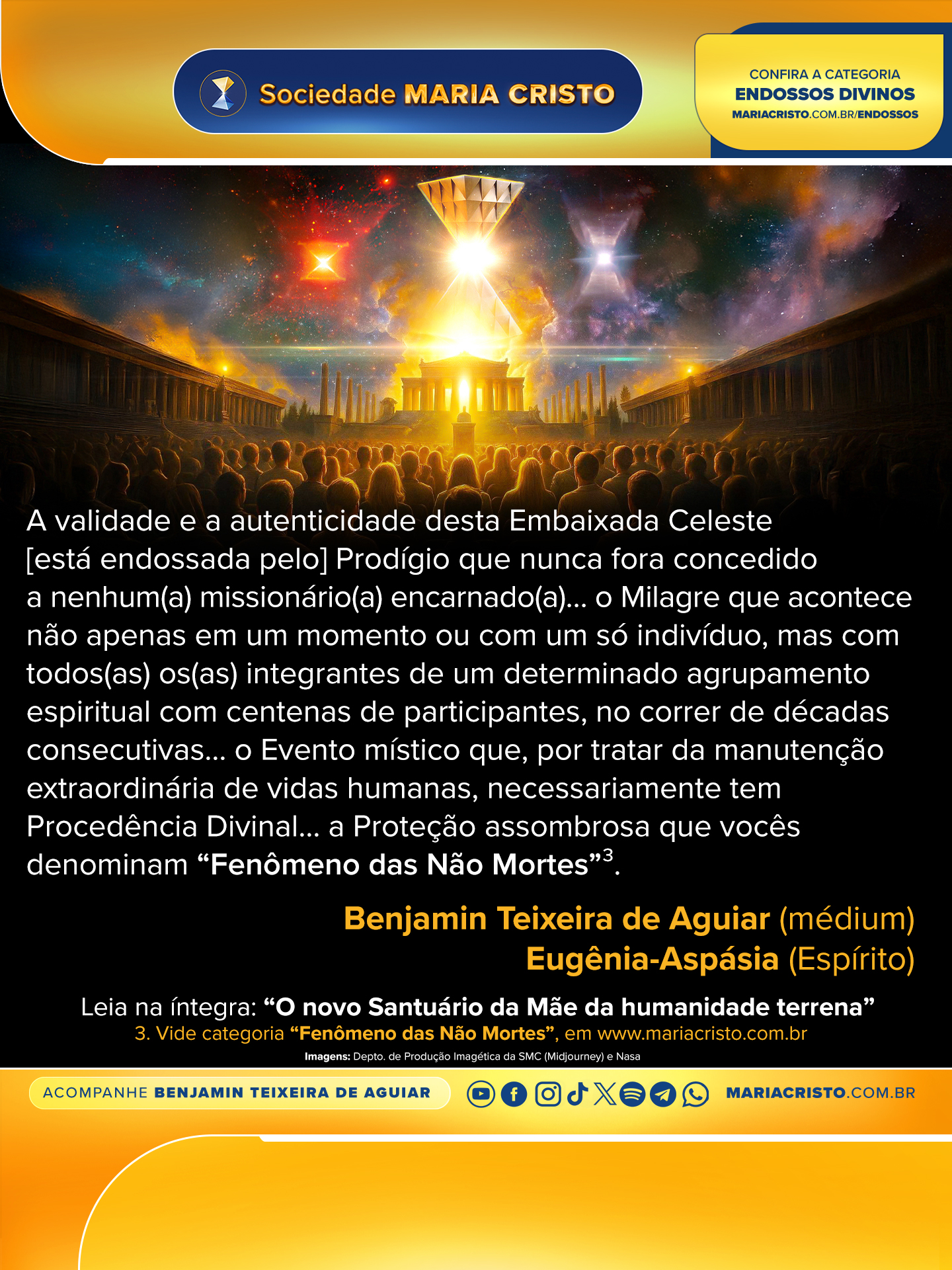 Lembrem-se, entretanto, da Graça singular que foi proporcionada pela Suprema Providência e que incontestavelmente endossa, para a presente e as futuras gerações da humanidade terrena, a validade e a autenticidade desta Embaixada Celeste: o Prodígio que nunca fora concedido a nenhum(a) missionário(a) encarnado(a)… o Milagre que acontece não apenas em um momento ou com um só indivíduo, mas com todos(as) os(as) integrantes de um determinado agrupamento espiritual com centenas de participantes, no correr de décadas consecutivas… o Evento místico que, por tratar da manutenção extraordinária de vidas humanas, necessariamente tem Procedência Divinal… a Proteção assombrosa que vocês denominam “Fenômeno das Não Mortes”3.