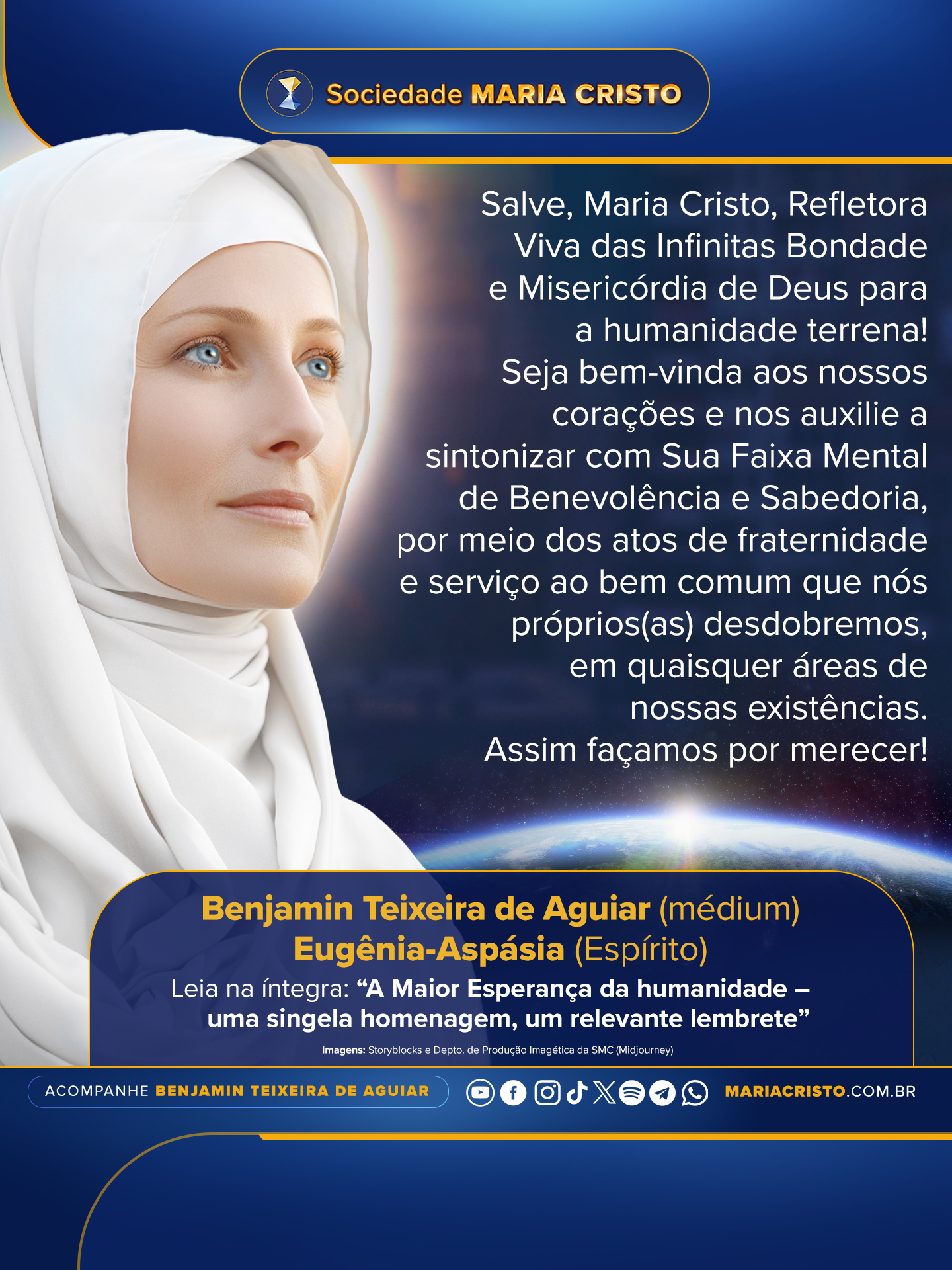 Seja bem-vinda aos nossos corações e nos auxilie a sintonizar com Sua Faixa Mental de Benevolência e Sabedoria, por meio dos atos de fraternidade e serviço ao bem comum que nós próprios(as) desdobremos, em quaisquer áreas de nossas existências.
