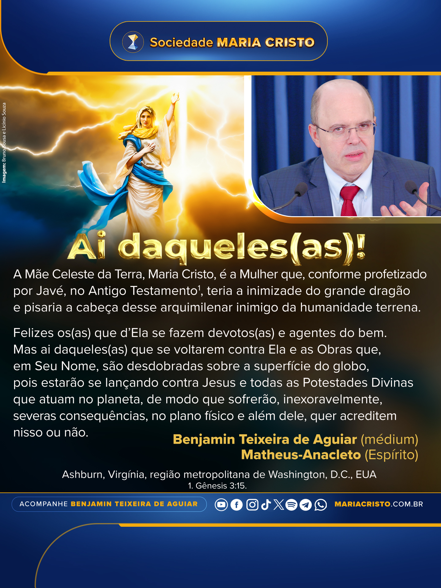 Felizes os(as) que d’Ela se fazem devotos(as) e agentes do bem. Mas ai daqueles(as) que se voltarem contra Ela e as Obras que, em Seu Nome, são desdobradas sobre a superfície do globo, pois estarão se lançando contra Jesus e todas as Potestades Divinas que atuam no planeta, de modo que sofrerão, inexoravelmente, severas consequências, no plano físico e além dele, quer acreditem nisso ou não.