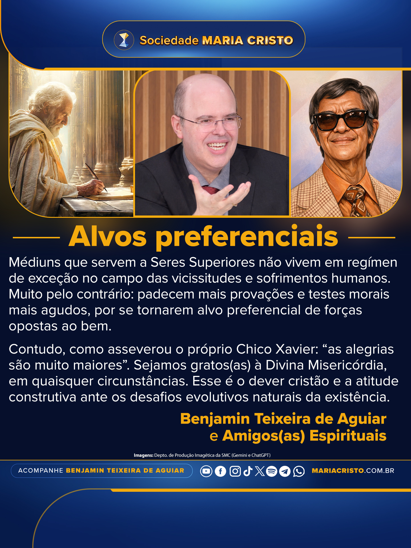 Contudo, como asseverou o próprio Chico Xavier: “as alegrias são muito maiores”. Sejamos gratos(as) à Divina Misericórdia, em quaisquer circunstâncias. Esse é o dever cristão e a atitude construtiva ante os desafios evolutivos naturais da existência.