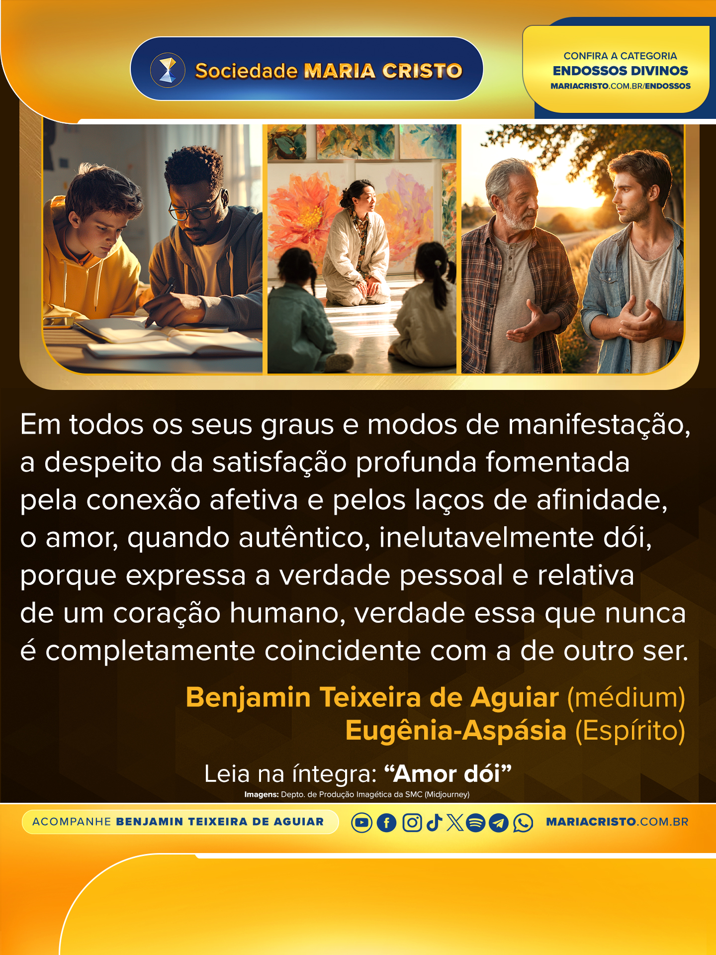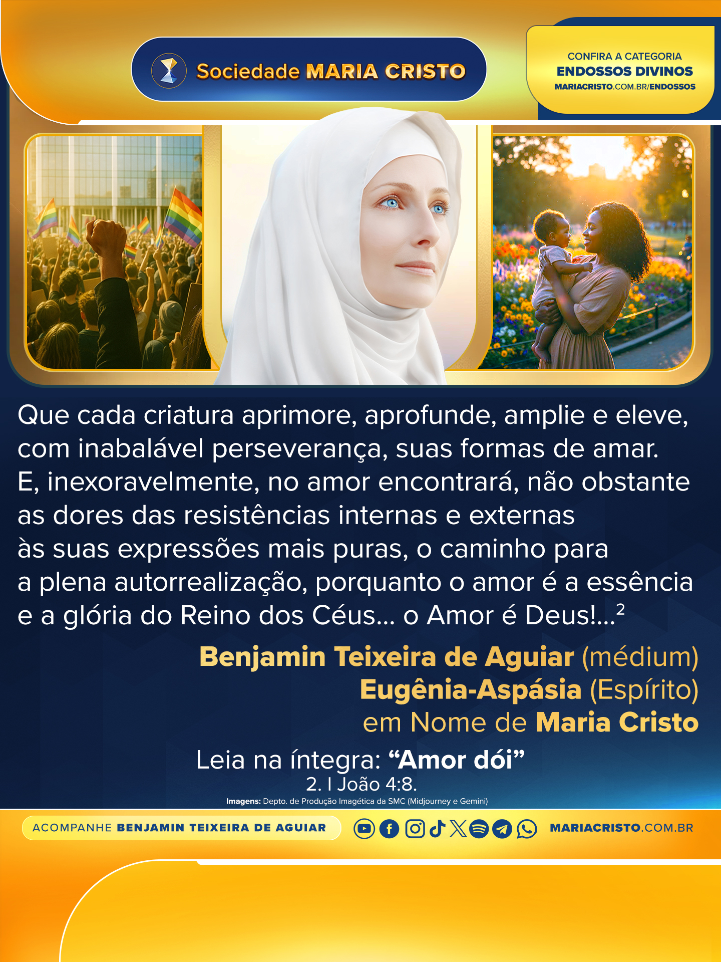 Que cada criatura aprimore, aprofunde, amplie e eleve, com inabalável perseverança, suas formas de amar. E, inexoravelmente, no amor encontrará, não obstante as dores das resistências internas e externas às suas expressões mais puras, o caminho para a plena autorrealização, porquanto o amor é a essência e a glória do Reino dos Céus… o Amor é Deus!…2