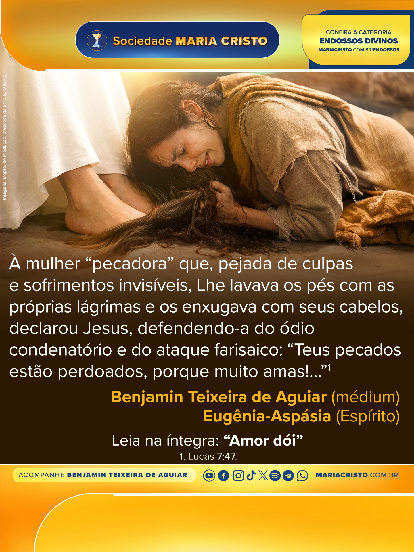 À mulher “pecadora” que, pejada de culpas e sofrimentos invisíveis, Lhe lavava os pés com as próprias lágrimas e os enxugava com seus cabelos, declarou Jesus, defendendo-a do ódio condenatório e do ataque farisaico: “Teus pecados estão perdoados, porque muito amas!…”1