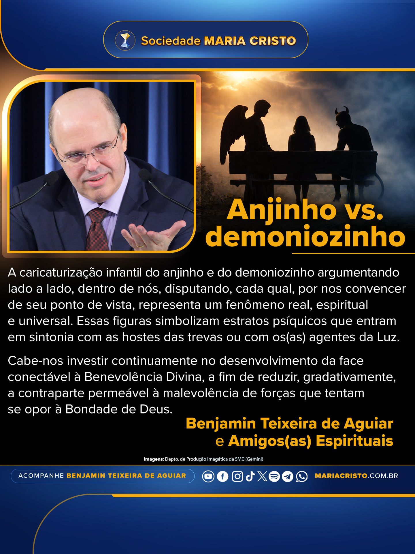 A caricaturização infantil do anjinho e do demoniozinho argumentando lado a lado, dentro de nós, disputando, cada qual, por nos convencer de seu ponto de vista, representa um fenômeno real, espiritual e universal. Essas figuras simbolizam estratos psíquicos que entram em sintonia com as hostes das trevas ou com os(as) agentes da Luz.