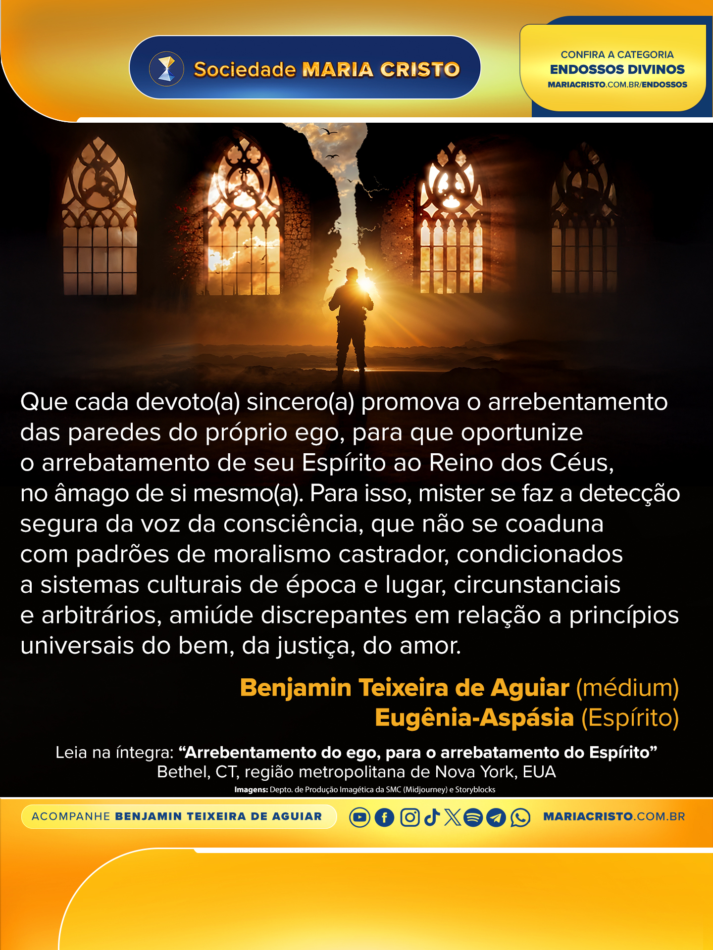 Que cada devoto(a) sincero(a) promova o arrebentamento das paredes do próprio ego, para que oportunize o arrebatamento de seu Espírito ao Reino dos Céus, no âmago de si mesmo(a).