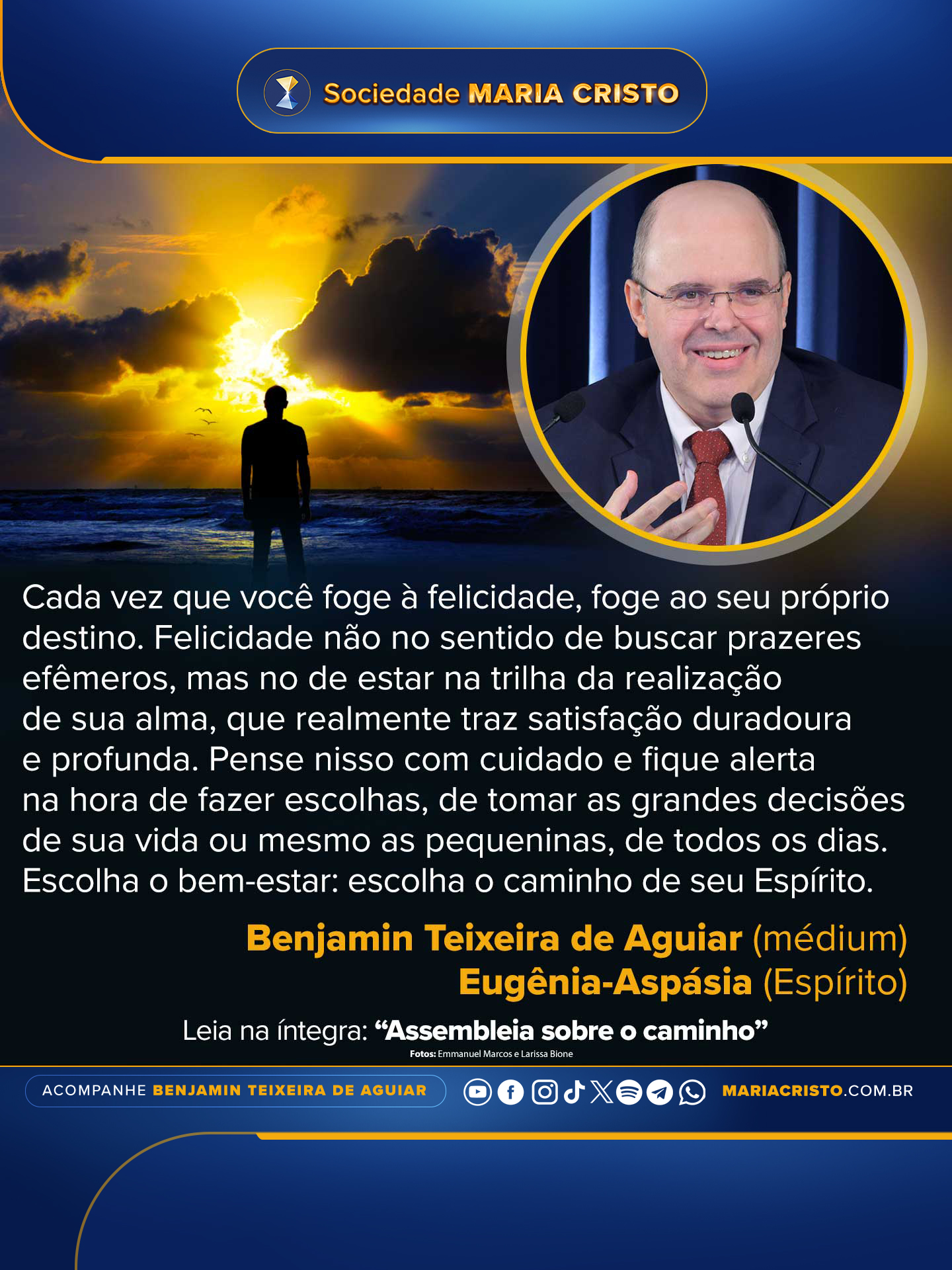 Cada vez, meu filho, que você foge à felicidade, foge ao seu próprio destino. Felicidade não no sentido de buscar prazeres efêmeros, mas no de estar na trilha da realização de sua alma, que realmente traz satisfação duradoura e profunda. Pense nisso com cuidado e fique alerta na hora de fazer escolhas, de tomar as grandes decisões de sua vida ou mesmo as pequeninas, de todos os dias. Escolha o bem-estar: escolha o caminho de seu Espírito.