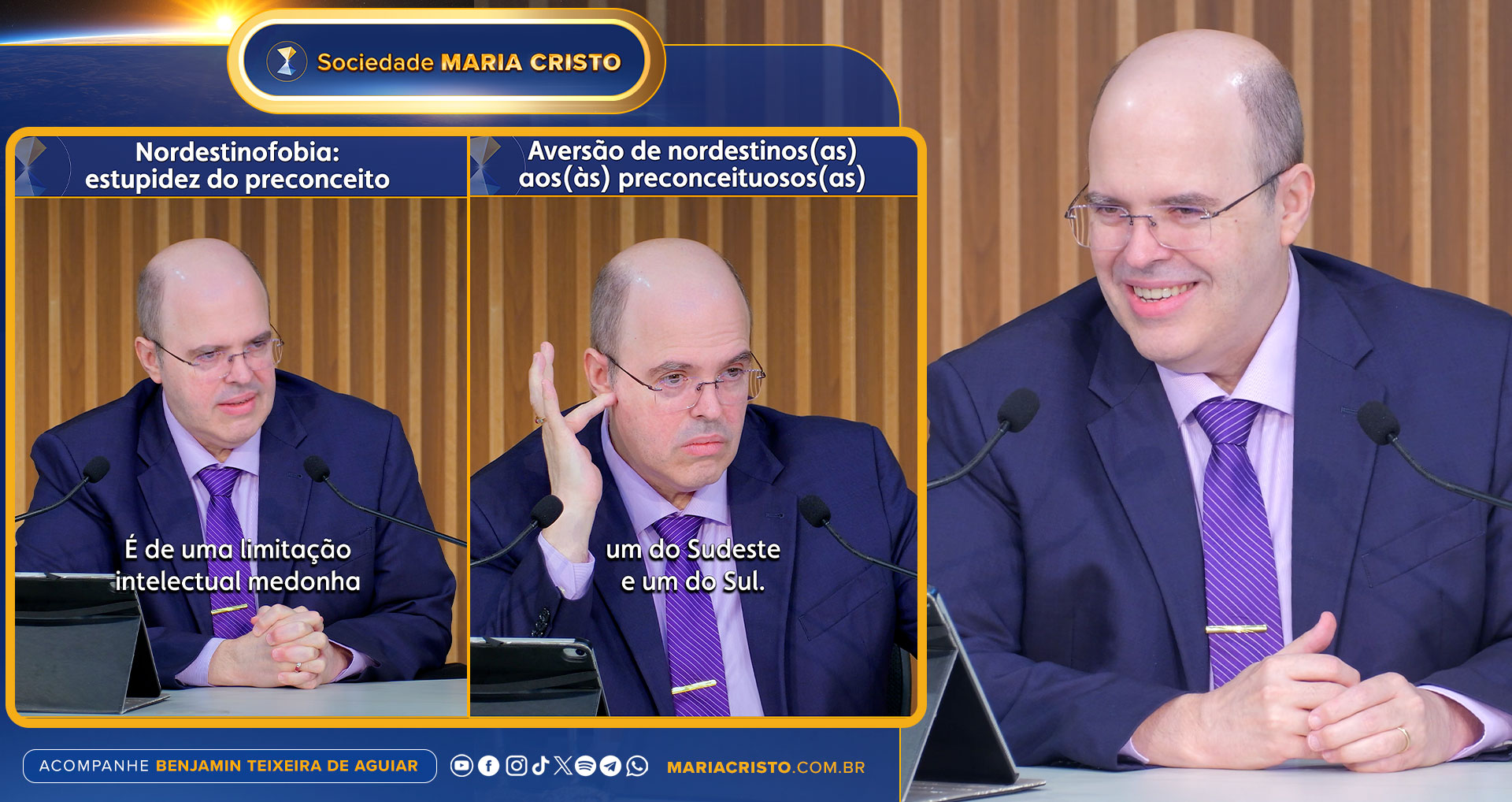 PALESTRAS “CENSURADAS”. Em momento de grave crise internacional, o orientador espiritual Benjamin Teixeira de Aguiar tem sido a voz do bom senso, da sabedoria, da supraordenação e da esperança para multidões no Brasil e além-fronteiras. Em sua preleção mais recente, de 1º/3, essa característica ficou bem evidenciada, não só na abordagem de temas intemporais, como o combate a todos os tipos de preconceitos, mas também nos esclarecimentos de conflitos e dilemas do momento presente, a exemplo do confronto bélico dos EUA com o Irã. Lamentavelmente, o arquivo completo da transmissão foi retirado do ar, por determinação do próprio palestrante, que considerou o discurso “impróprio” para pessoas menos preparadas a compreender sua veemência na defesa dos ideais humanitários, seu espírito aguerrido contra a maldade por detrás da perseguição e do ataque a minorias, sua perspectiva altamente vanguardista para os padrões evolutivos atuais da humanidade. Mas nem tudo está perdido para quem não acompanhou em tempo real: alguns microvídeos já foram extraídos da impactante conferência e estão bombando, com centenas de milhares de visualizações, nas redes sociais do ilustre professor de espiritualidade. Dois deles, por sinal, lavam a alma dos(as) nordestinos(as): “Nordestinofobia: estupidez do preconceito” e “Aversão de nordestinos(as) aos(às) preconceituosos(as)”. A repercussão de alguns desses “reels/shorts” chegou a alcançar inclusive celebridades “globais” (sem exagero), que têm deixado seus sinais públicos de engajamento. Vale a pena registrar na agenda, porque nunca se sabe se o conteúdo permanecerá ou não disponível, neste período de assuntos mais delicados e polêmicos: 8/3, Dia Internacional da Mulher, às 18h, na Sede da Sociedade Maria Cristo, perto dos “Arcos da Orla” – Rua Niceu Dantas, 266, Atalaia, Aracaju. A entrada é franca, como sempre.