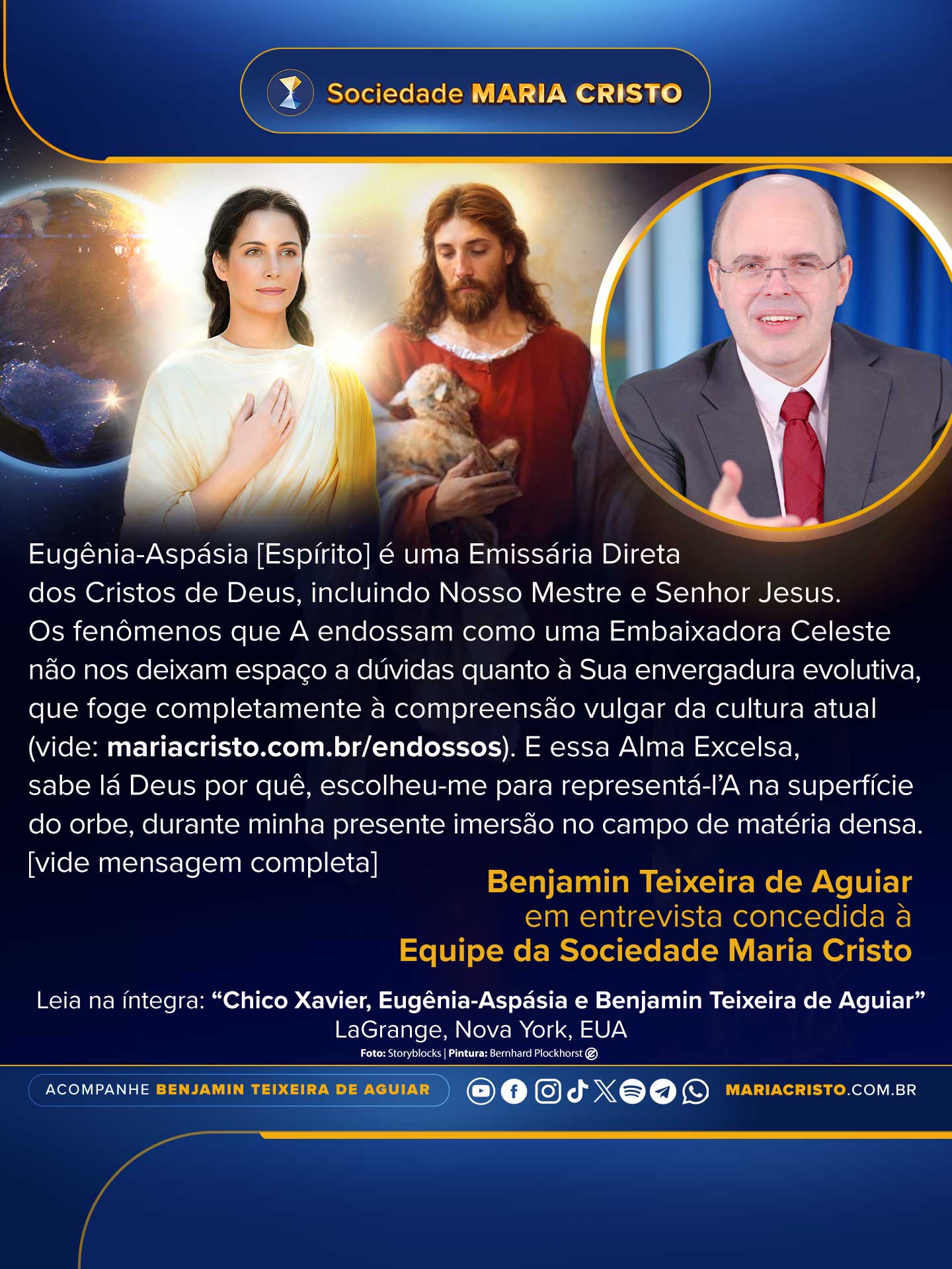 Eugênia-Aspásia é uma Emissária Direta dos Cristos de Deus, incluindo Nosso Mestre e Senhor Jesus. Os fenômenos que A endossam como uma Embaixadora Celeste não nos deixam espaço a dúvidas quanto à Sua envergadura evolutiva, que foge completamente à compreensão vulgar da cultura atual (vide: mariacristo.com.br/endossos). E essa Alma Excelsa, sabe lá Deus por quê, escolheu-me para representá-l’A na superfície do orbe, durante minha presente imersão no campo de matéria densa.
