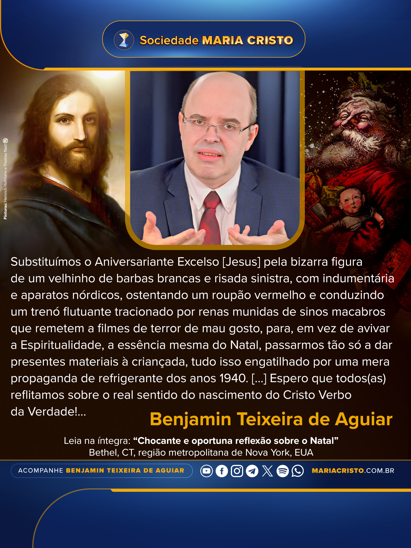 Substituímos o Aniversariante Excelso pela bizarra figura de um velhinho de barbas brancas e risada sinistra, com indumentária e aparatos nórdicos, ostentando um roupão vermelho e conduzindo um trenó flutuante tracionado por renas munidas de sinos macabros que remetem a filmes de terror de mau gosto, para, em vez de avivar a Espiritualidade, a essência mesma do Natal, passarmos tão só a dar presentes materiais à criançada, tudo isso engatilhado por uma mera propaganda de refrigerante dos anos 1940.