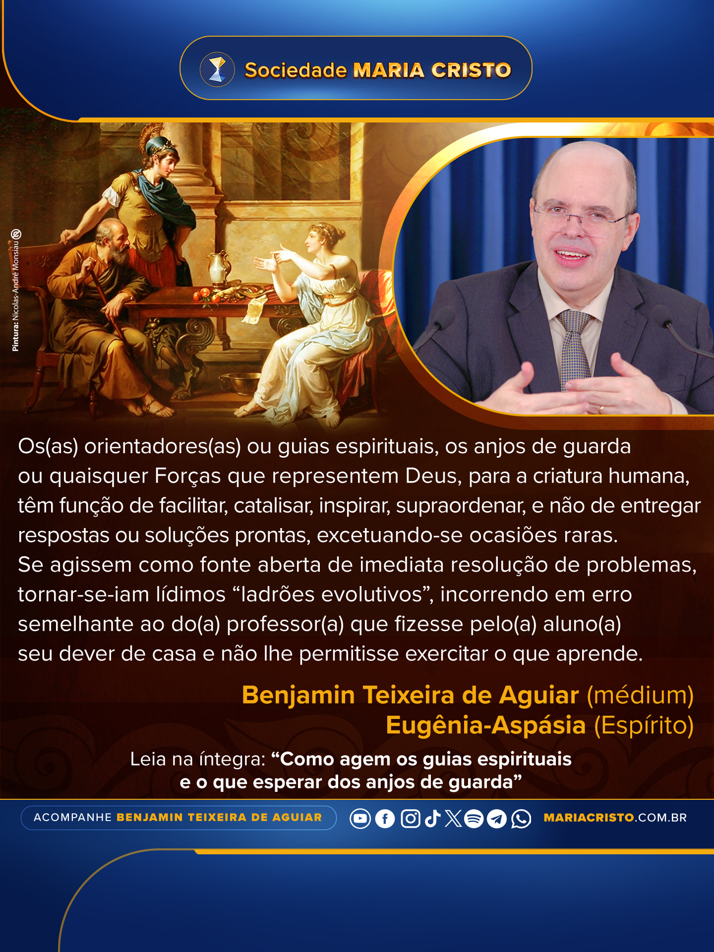 Os orientadores ou guias espirituais, os anjos de guarda ou quaisquer Forças que representem Deus, para a criatura humana, têm função de facilitar, catalisar, inspirar, supraordenar, e não de entregar respostas ou soluções prontas, excetuando-se ocasiões raras. Se agissem como fonte aberta de imediata resolução de problemas, tornar-se-iam lídimos “ladrões evolutivos”, incorrendo em erro semelhante ao do(a) professor(a) que fizesse pelo(a) aluno(a) seu dever de casa e não lhe permitisse exercitar o que aprende.