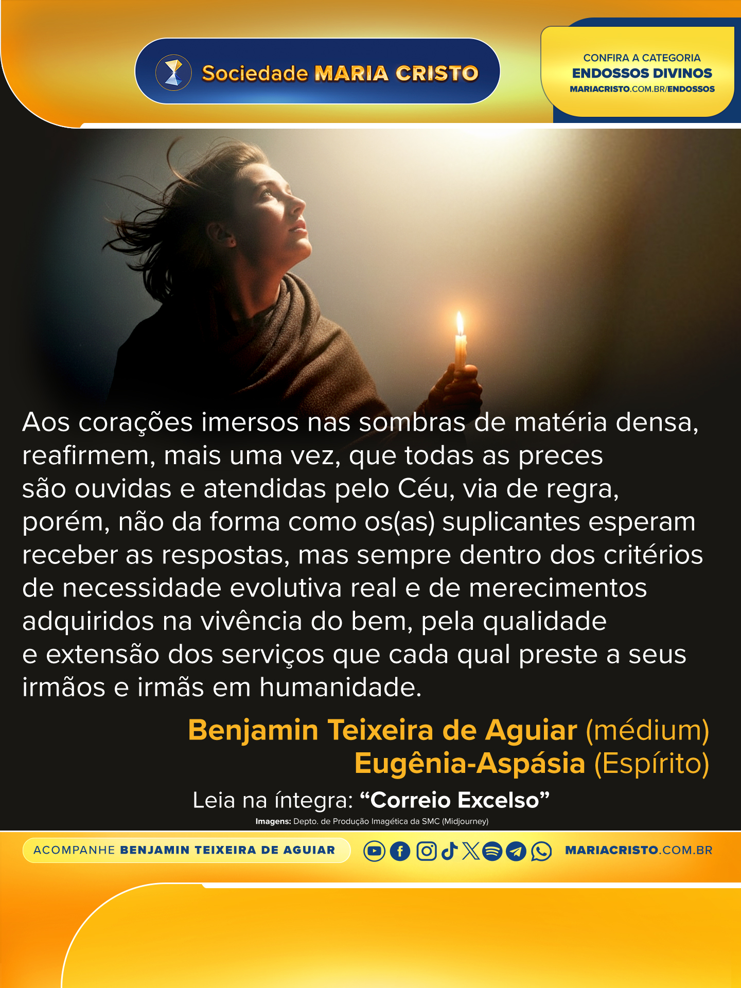 Aos corações imersos nas sombras de matéria densa, reafirmem, mais uma vez, que todas as preces são ouvidas e atendidas pelo Céu, via de regra, porém, não da forma como os(as) suplicantes esperam receber as respostas, mas sempre dentro dos critérios de necessidade evolutiva real e de merecimentos adquiridos na vivência do bem, pela qualidade e extensão dos serviços que cada qual preste a seus irmãos e irmãs em humanidade.