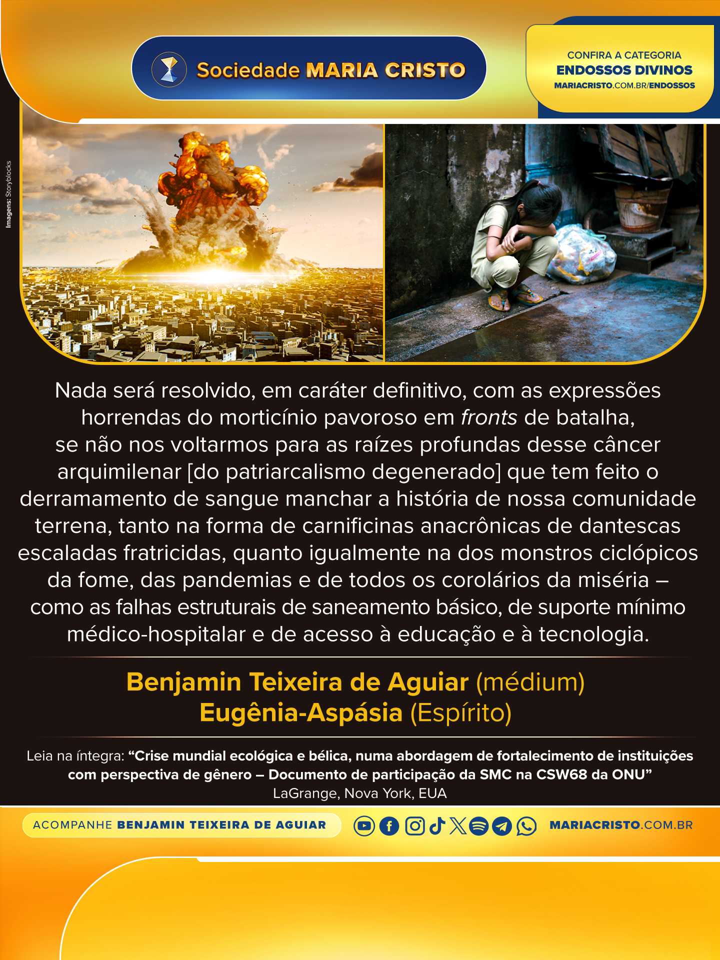 Nada será resolvido, em caráter definitivo, com as expressões horrendas do morticínio pavoroso em fronts de batalha, se não nos voltarmos para as raízes profundas desse câncer arquimilenar que tem feito o derramamento de sangue manchar a história de nossa comunidade terrena, tanto na forma de carnificinas anacrônicas de dantescas escaladas fratricidas, quanto igualmente na dos monstros ciclópicos da fome, das pandemias e de todos os corolários da miséria – como as falhas estruturais de saneamento básico, de suporte mínimo médico-hospitalar e de acesso à educação e à tecnologia.