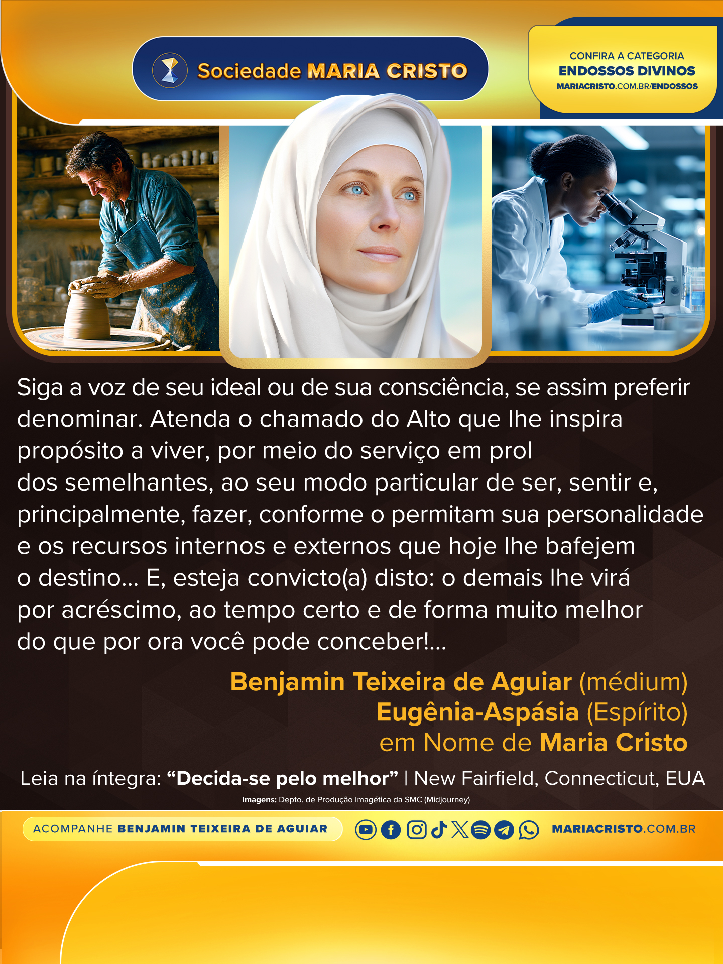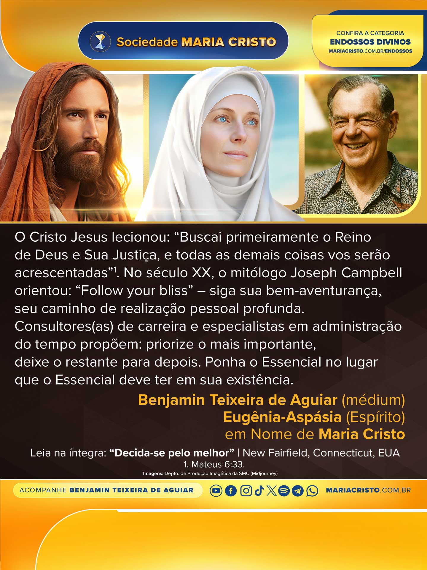 Ponha o Essencial no lugar que o Essencial deve ter em sua existência. Siga a voz de seu ideal ou de sua consciência, se assim preferir denominar. Atenda o chamado do Alto que lhe inspira propósito a viver, por meio do serviço em prol dos semelhantes, ao seu modo particular de ser, sentir e, principalmente, fazer, conforme o permitam sua personalidade e os recursos internos e externos que hoje lhe bafejem o destino…
