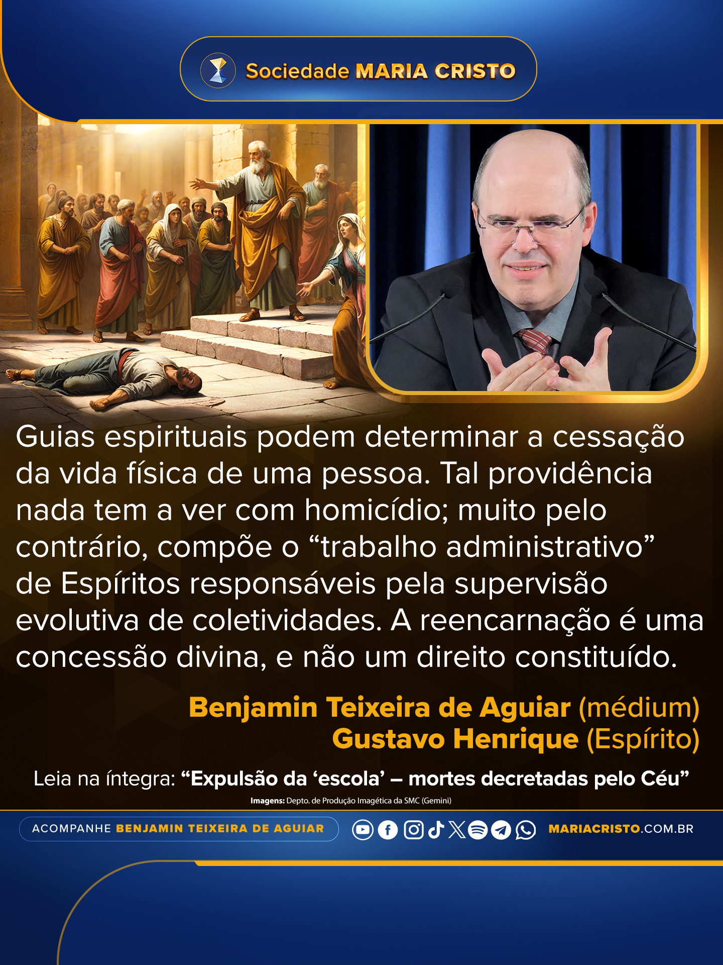 Guias espirituais podem determinar a cessação da vida física de uma pessoa. Tal providência nada tem a ver com homicídio; muito pelo contrário, compõe o “trabalho administrativo” de Espíritos responsáveis pela supervisão evolutiva de coletividades. A reencarnação é uma concessão divina, e não um direito constituído.