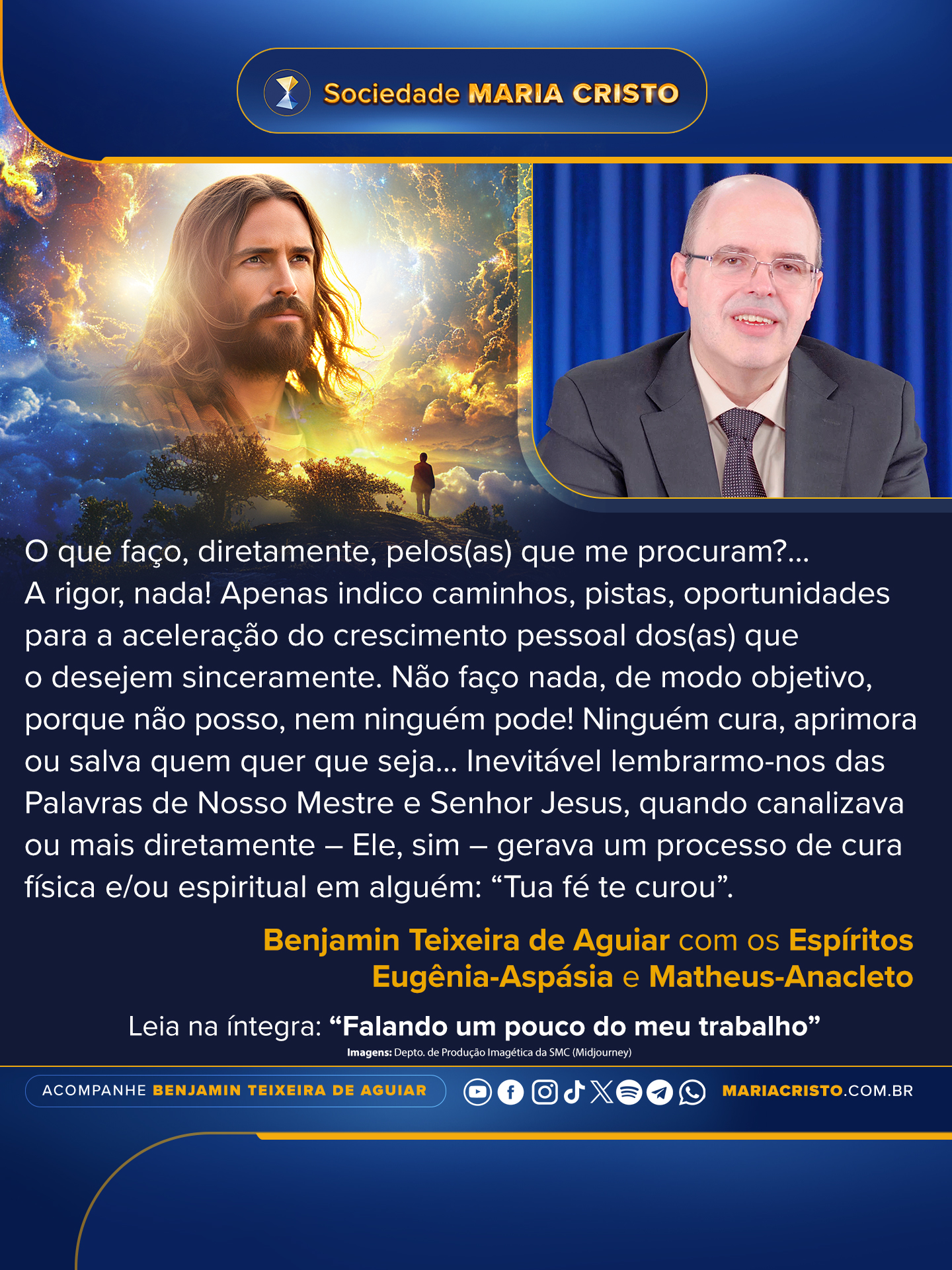 Inevitável lembrarmo-nos das Palavras de Nosso Mestre e Senhor Jesus, quando canalizava ou mais diretamente – Ele, sim – gerava um processo de cura física e/ou espiritual em alguém: “Tua fé te curou”. Em vernáculo atual, essa Máxima pode ser traduzida como: “Sua decisão profunda e verdadeira em buscar detectar com clareza e resolver de fato seu(s) problema(s), evidenciada em empenho, disciplina e persistência, propiciou-lhe a(s) solução(ões) efetiva(s).”