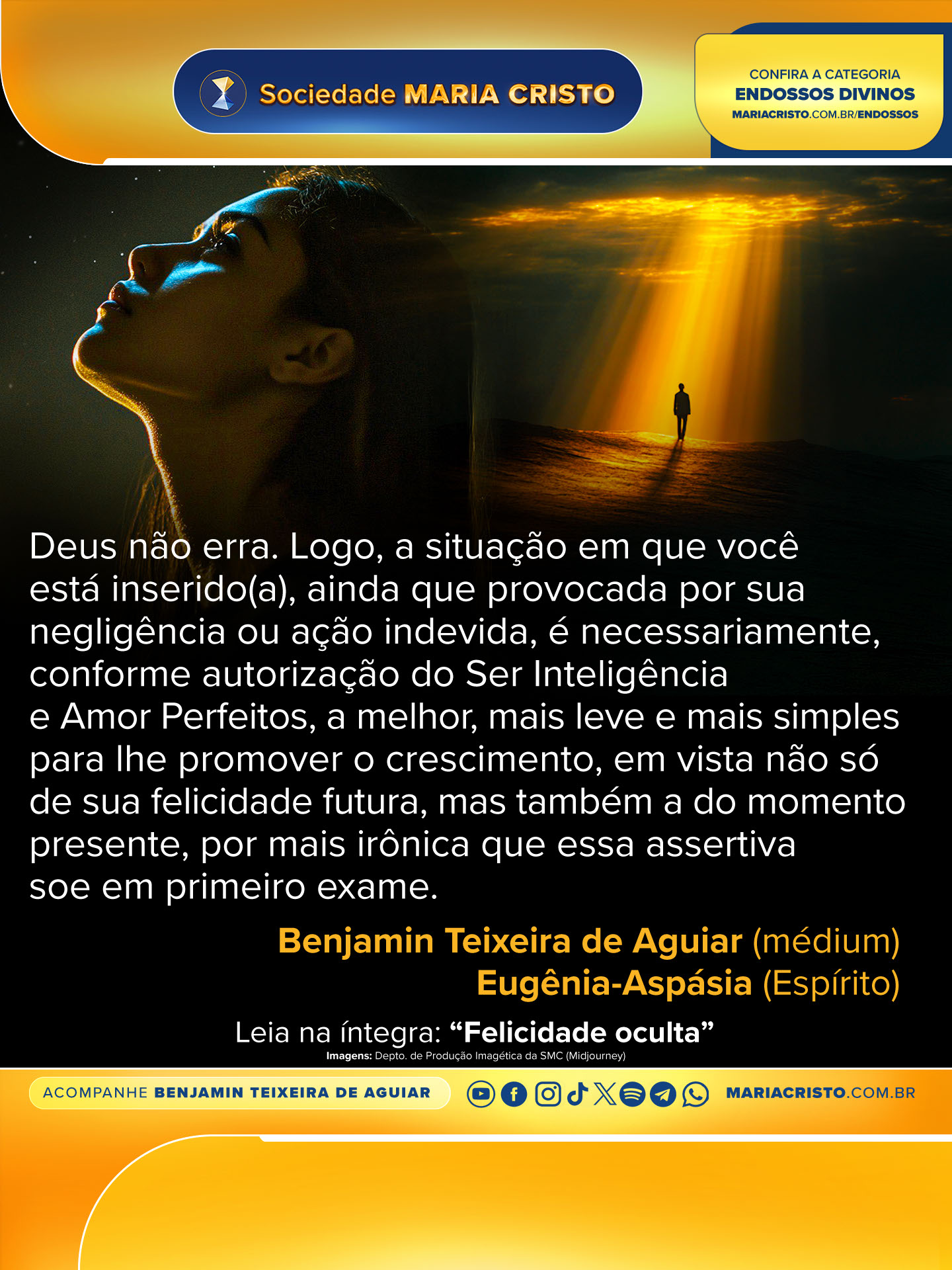 Deus não erra. Logo, a situação em que você está inserido(a), ainda que provocada por sua negligência ou ação indevida, é necessariamente, conforme autorização do Ser Inteligência e Amor Perfeitos, a melhor, mais leve e mais simples para lhe promover o crescimento, em vista não só de sua felicidade futura, mas também a do momento presente, por mais irônica que essa assertiva soe em primeiro exame.