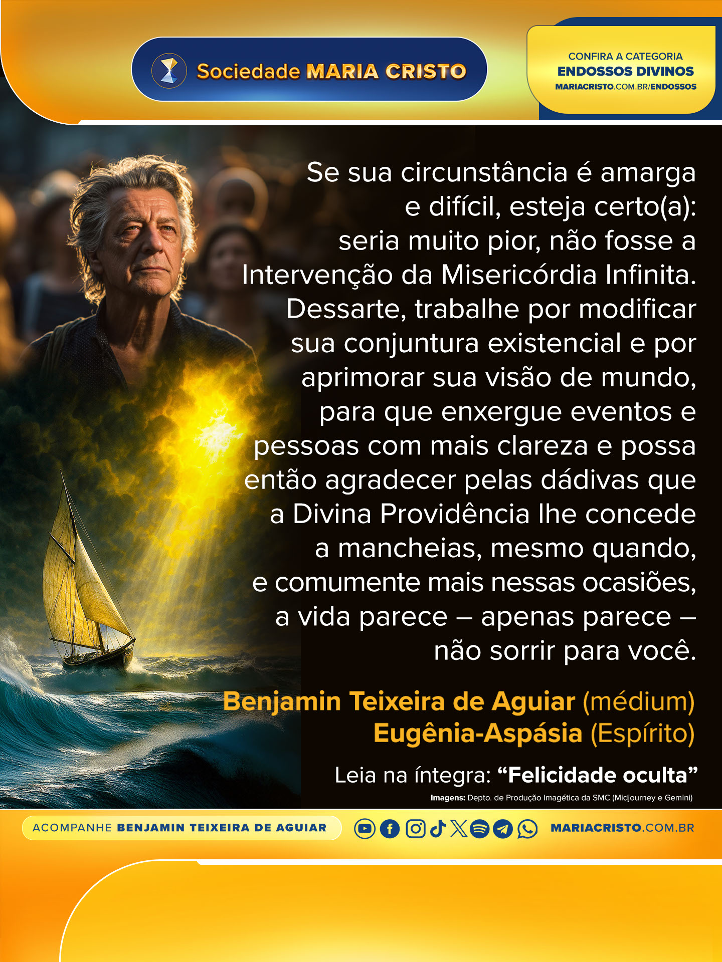Dessarte, trabalhe por modificar sua conjuntura existencial e por aprimorar sua visão de mundo, para que enxergue eventos e pessoas com mais clareza e possa então agradecer pelas dádivas que a Divina Providência lhe concede a mancheias, mesmo quando, e comumente mais nessas ocasiões, a vida parece – apenas parece – não sorrir para você.