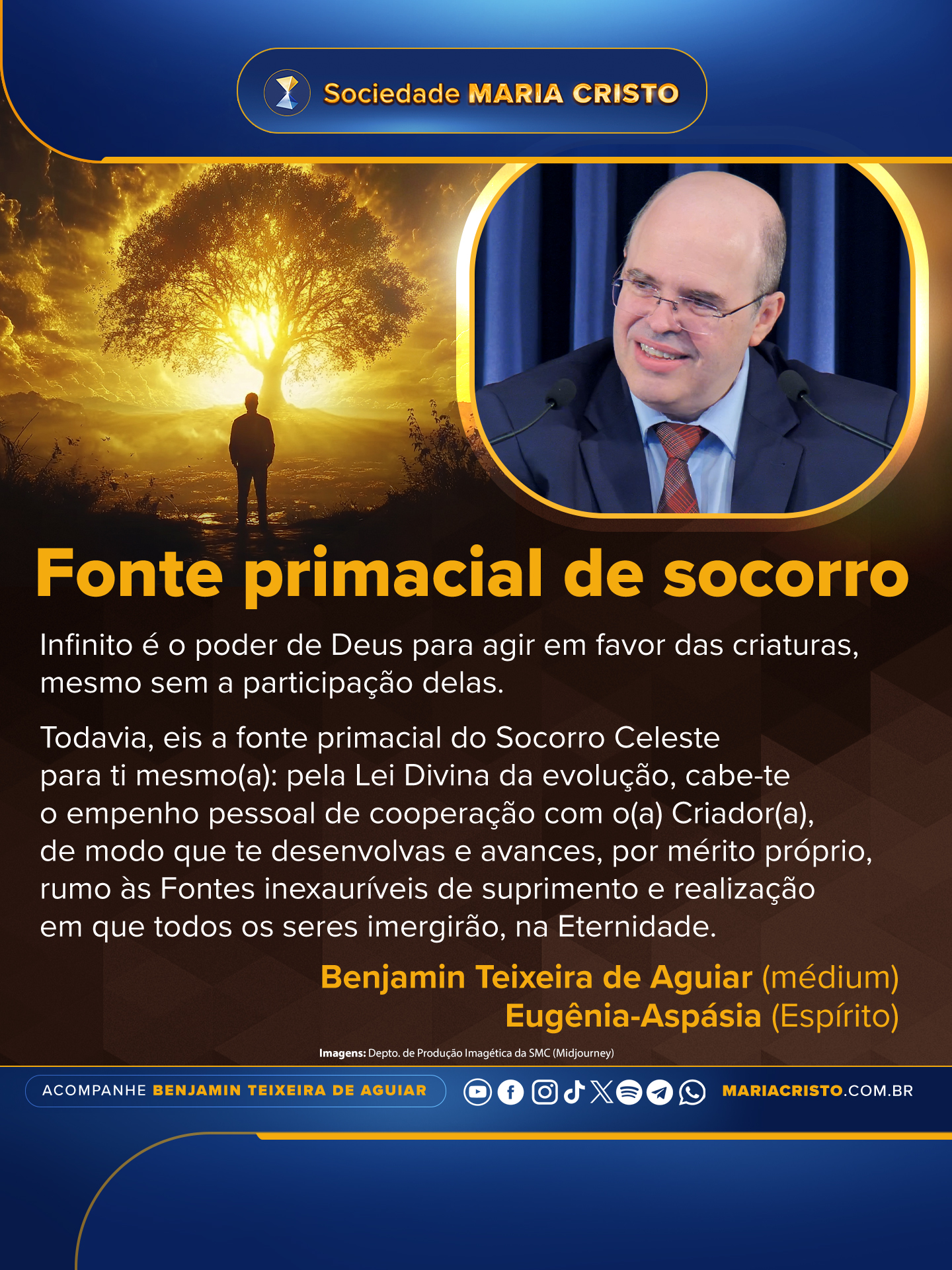 Todavia, eis a fonte primacial do Socorro Celeste para ti mesmo(a): pela Lei Divina da evolução, cabe-te o empenho pessoal de cooperação com o(a) Criador(a), de modo que te desenvolvas e avances, por mérito próprio, rumo às Fontes inexauríveis de suprimento e realização em que todos os seres imergirão, na Eternidade.