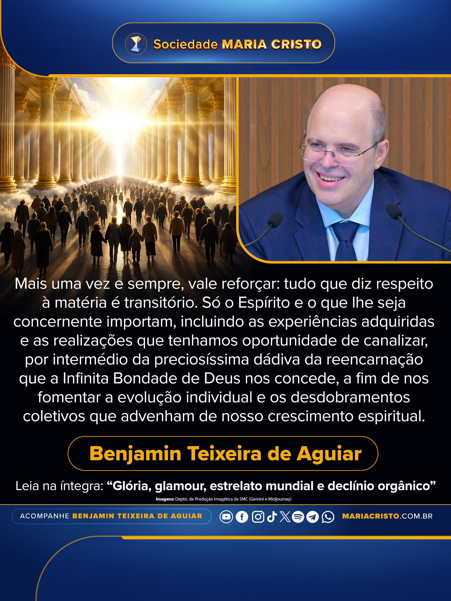 Mais uma vez e sempre, vale reforçar: tudo que diz respeito à matéria é transitório. Só o Espírito e o que lhe seja concernente importam, incluindo as experiências adquiridas e as realizações que tenhamos oportunidade de canalizar, por intermédio da preciosíssima dádiva da reencarnação que a Infinita Bondade de Deus nos concede, a fim de nos fomentar a evolução individual e os desdobramentos coletivos que advenham de nosso crescimento espiritual.