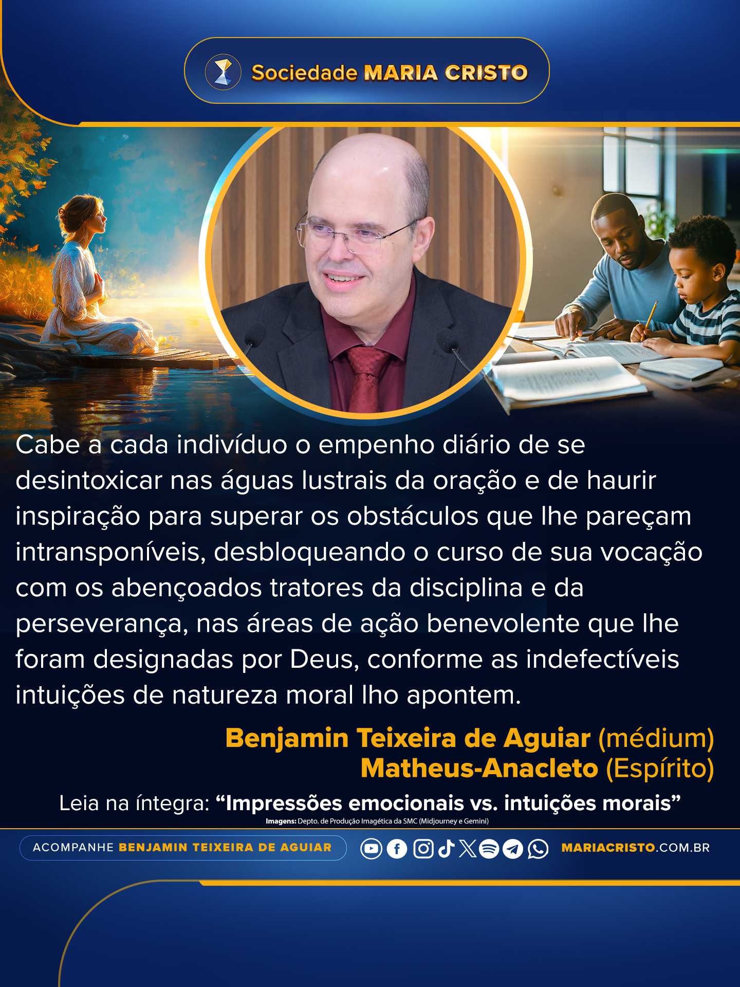 Cabe a cada indivíduo o empenho diário de se desintoxicar nas águas lustrais da oração e de haurir inspiração para superar os obstáculos que lhe pareçam intransponíveis, desbloqueando o curso de sua vocação com os abençoados tratores da disciplina e da perseverança, nas áreas de ação benevolente que lhe foram designadas por Deus, conforme as indefectíveis intuições de natureza moral lho apontem.