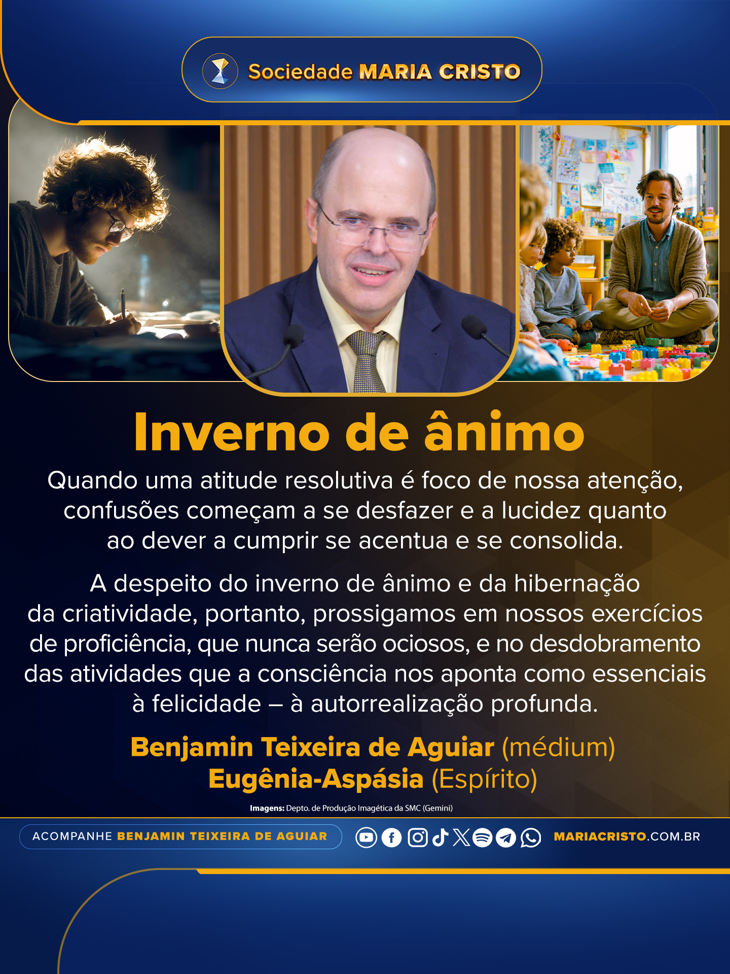 A despeito do inverno de ânimo e da hibernação da criatividade, portanto, prossigamos em nossos exercícios de proficiência, que nunca serão ociosos, e no desdobramento das atividades que a consciência nos aponta como essenciais à felicidade – à autorrealização profunda.