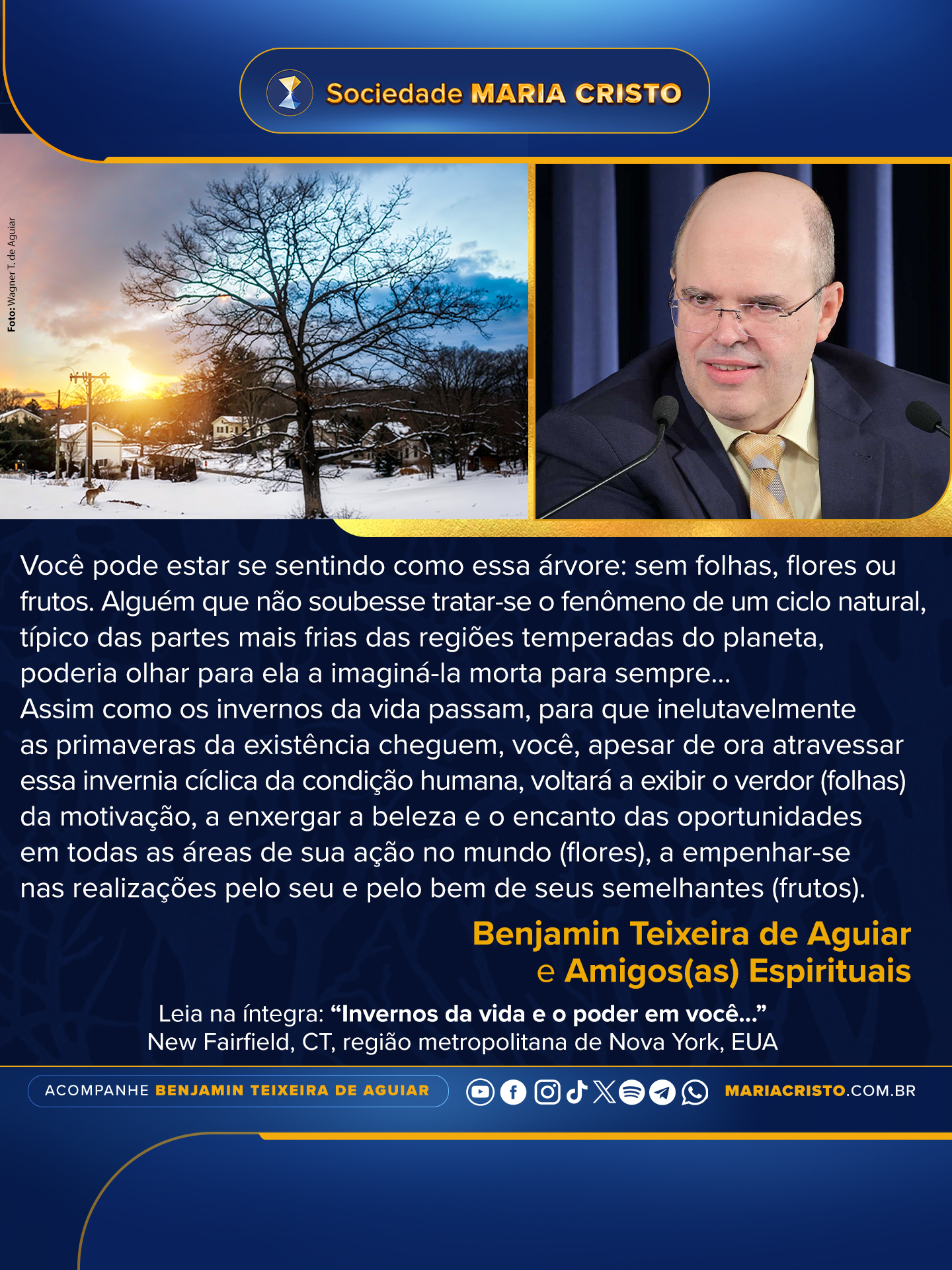 Assim como os invernos da vida passam, para que inelutavelmente as primaveras da existência cheguem, você, apesar de ora atravessar essa invernia cíclica da condição humana, voltará a exibir o verdor (folhas) da motivação, a enxergar a beleza e o encanto das oportunidades em todas as áreas de sua ação no mundo (flores), a empenhar-se nas realizações pelo seu e pelo bem de seus semelhantes (frutos).
