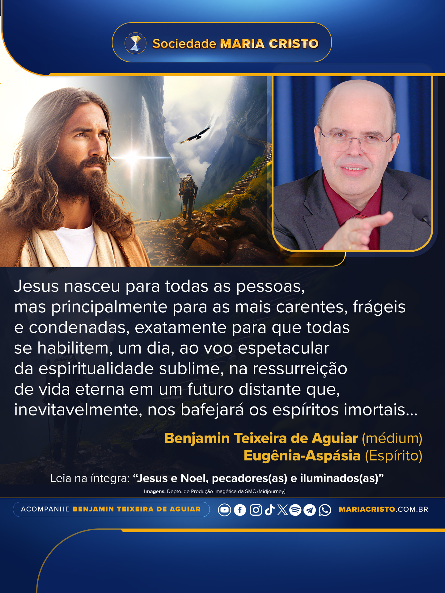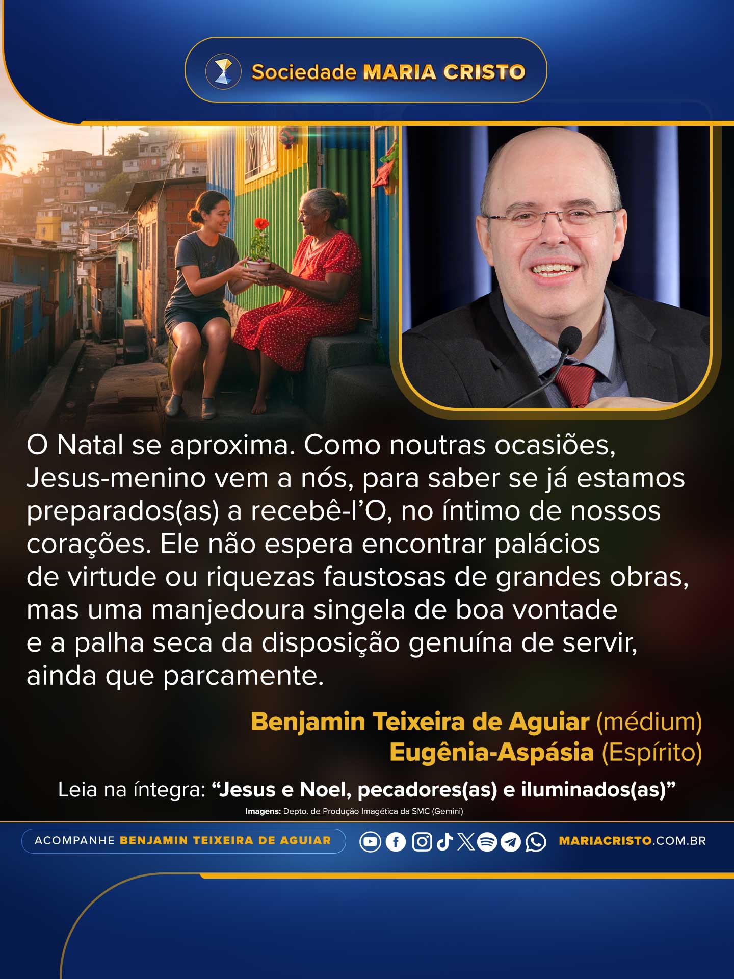 Busquemos nos alinhar com a presença do Cristo Cósmico, acessível a todos(as) que de fato se empenhem nesse intento, sejam bons(boas) ou maus(más), virtuosos(as) ou pecadores(as), nobres ou vacilantes. Compreendamos que Jesus-menino desceu à ribalta terrena justamente para aqueles(as) que só podem receber em seus corações uma criança de espiritualidade e não um adulto de maturidade moral, que não suportariam viver.