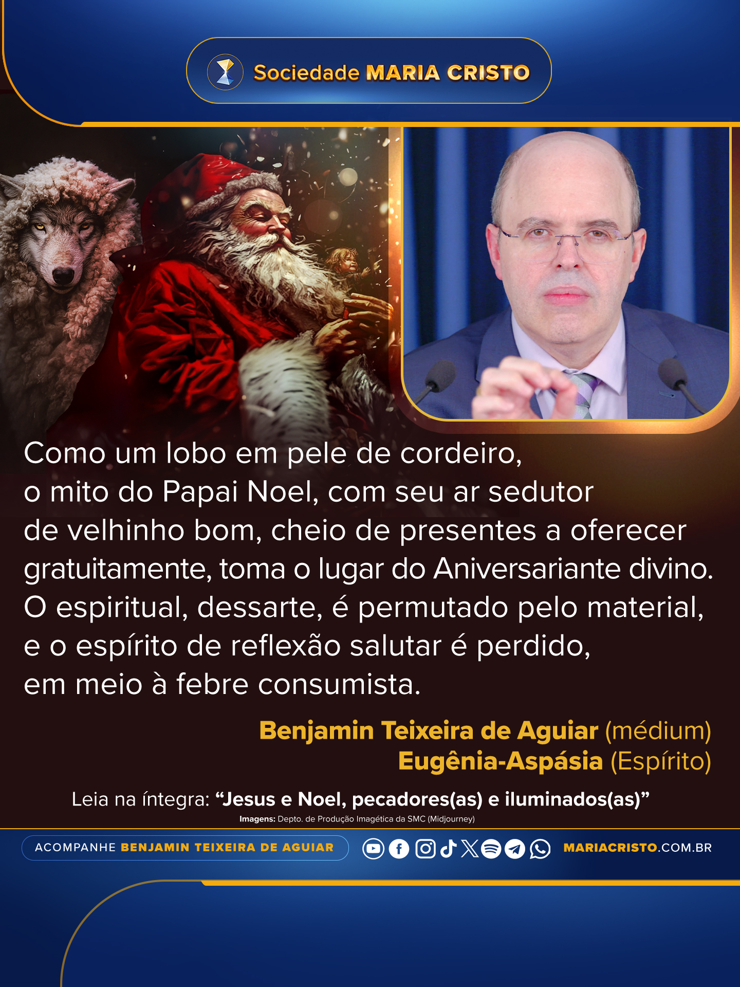 E, assim, como um lobo em pele de cordeiro, o mito do Papai Noel, com seu ar sedutor de velhinho bom, cheio de presentes a oferecer gratuitamente, toma o lugar do Aniversariante divino. O espiritual, dessarte, é permutado pelo material, e o espírito de reflexão salutar é perdido, em meio à febre consumista.