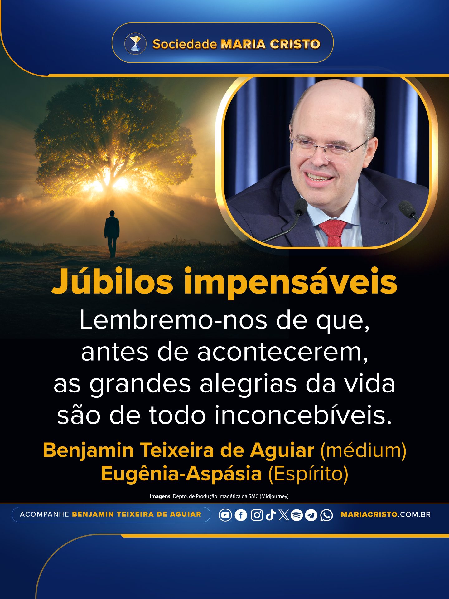 Júbilos impensáveis31 de outubro de 2025 | Banners de sabedoria, Espírito Eugênia-Aspásia, Mensagens sumárias Lembremo-nos de que, antes de acontecerem, as grandes alegrias da vida são de todo inconcebíveis. Benjamin Teixeira de Aguiar (médium) Eugênia-Aspásia (Espírito) 7 de outubro de 2025