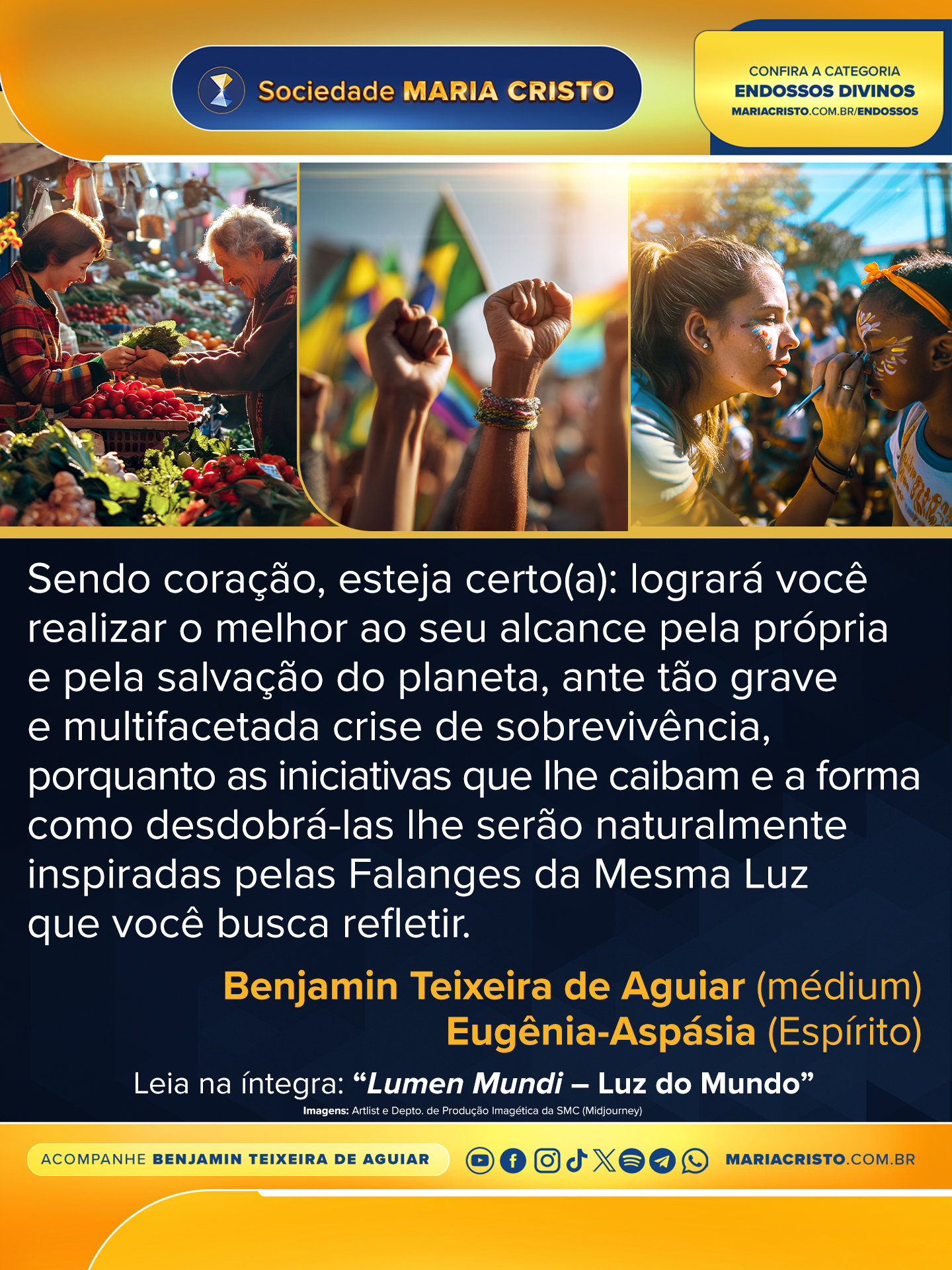 Sendo coração, esteja certo(a): logrará você realizar o melhor ao seu alcance pela própria e pela salvação do planeta, ante tão grave e multifacetada crise de sobrevivência, porquanto as iniciativas que lhe caibam e a forma como desdobrá-las lhe serão naturalmente inspiradas pelas Falanges da Mesma Luz que você busca refletir.