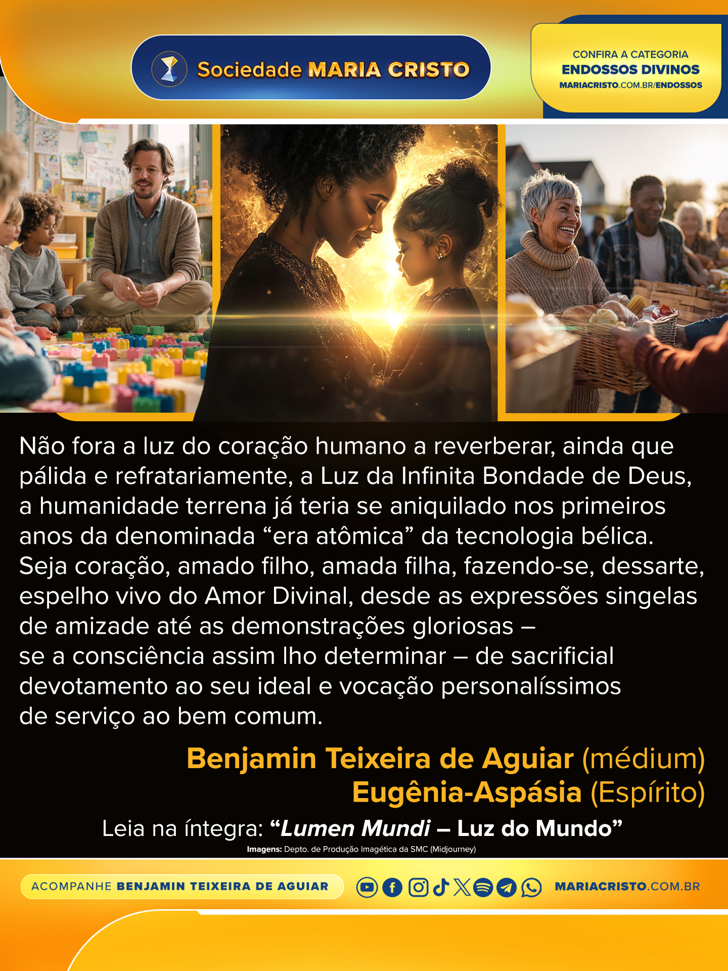 Não fora a luz do coração humano a reverberar, ainda que pálida e refratariamente, a Luz da Infinita Bondade de Deus, a humanidade terrena já teria se aniquilado nos primeiros anos da denominada “era atômica” da tecnologia bélica.