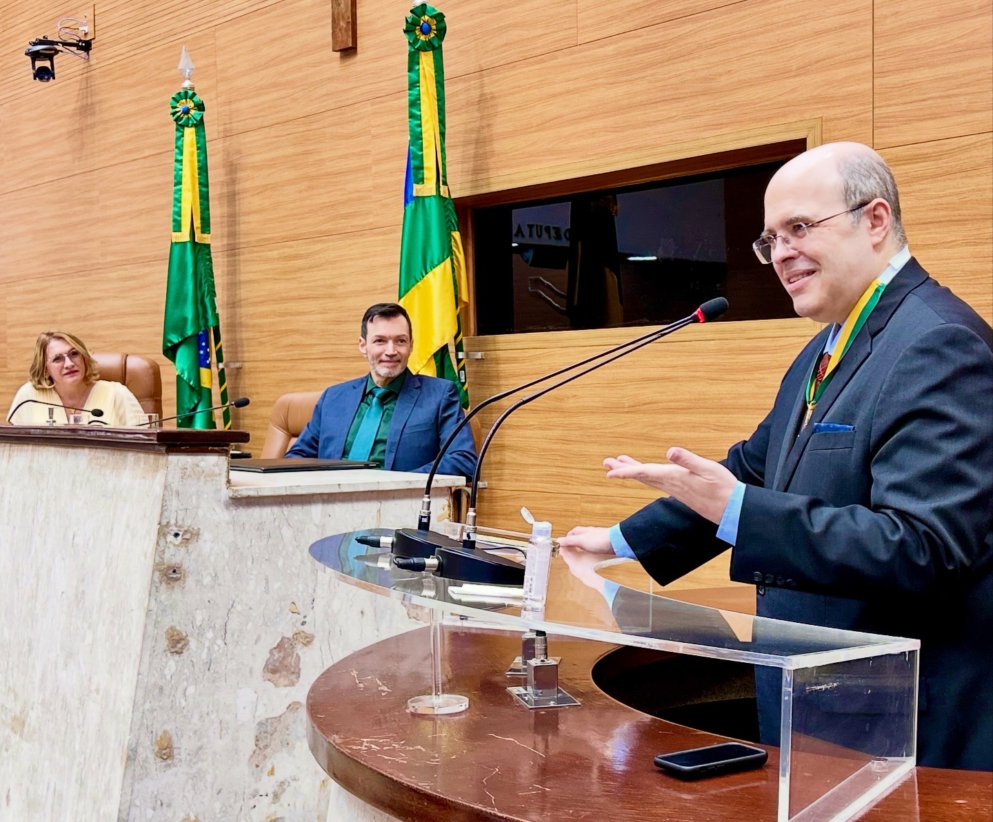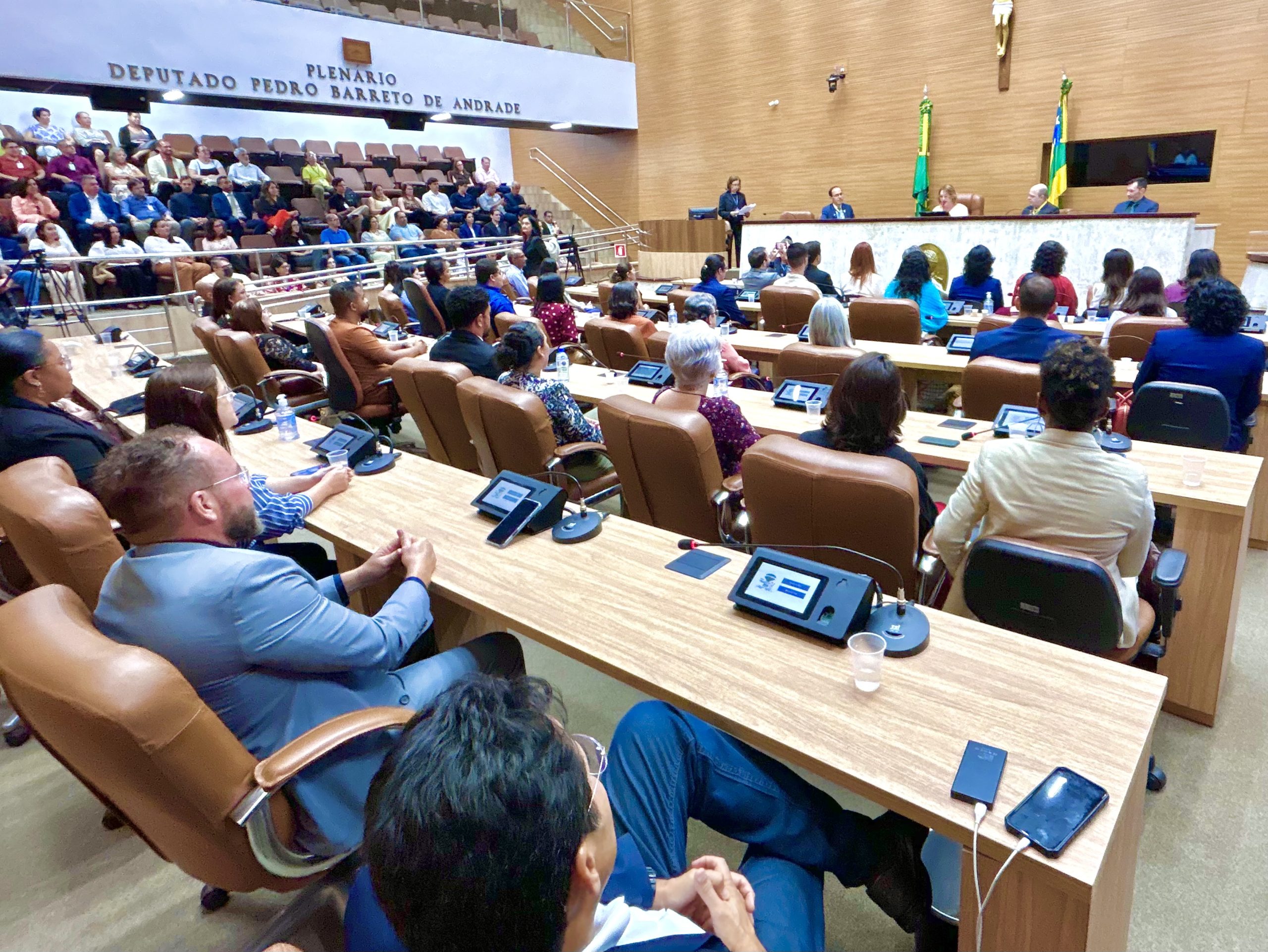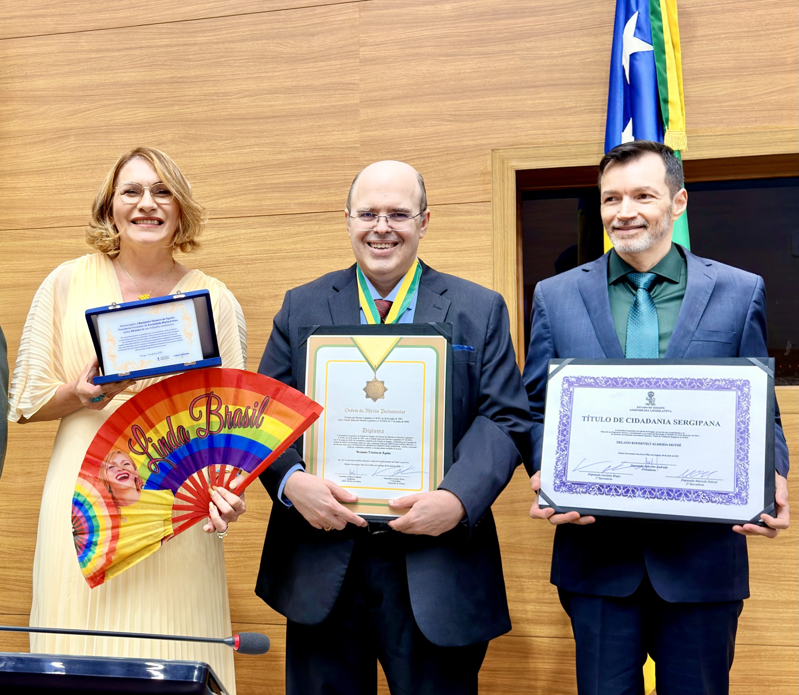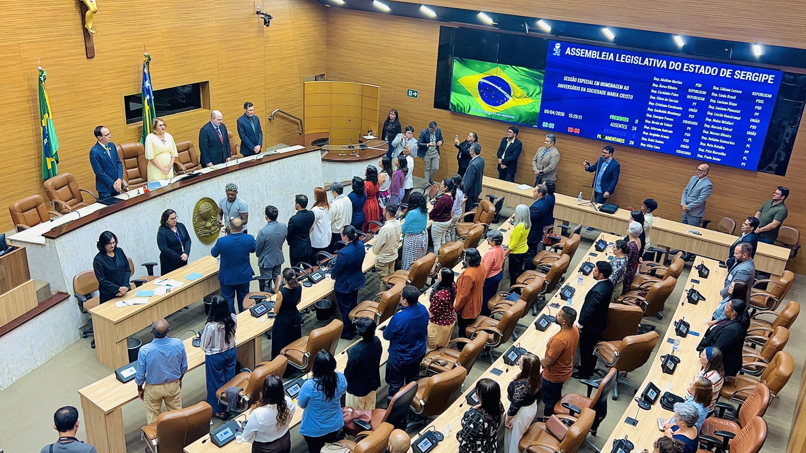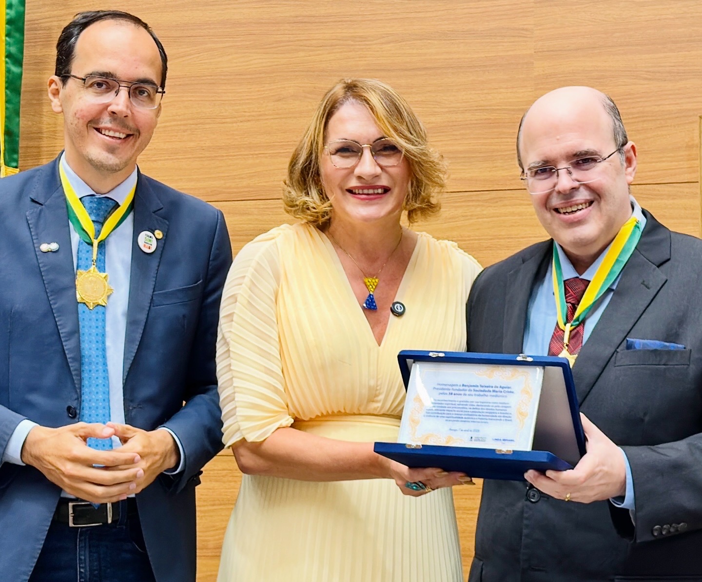 Mais registros fotográficos da solenidade especial que a Assembleia Legislativa de Sergipe realizou na quinta-feira passada (9/4), por iniciativa da deputada estadual Linda Brasil, a fim de condecorar o orientador espiritual Benjamin Teixeira de Aguiar com a Medalha da Ordem do Mérito Parlamentar, em homenagem aos 38 anos de seu trabalho mediúnico à frente da Sociedade Maria Cristo (SMC). Na mesma cerimônia, Delano Mothé, diretor do Departamento de Revisão Textual e Produção Editorial da SMC, recebeu o título de Cidadania Sergipana.