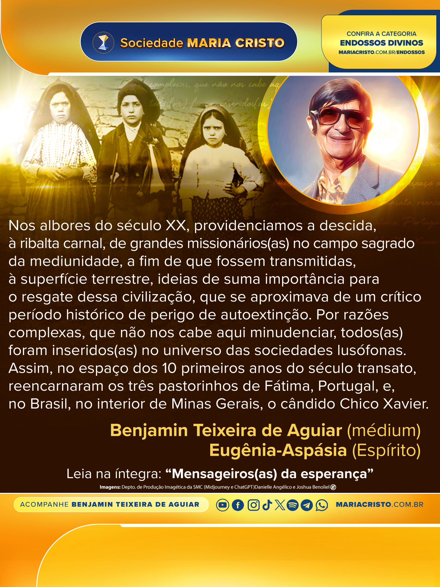 Assim, no espaço dos 10 primeiros anos do século transato, reencarnaram os três pastorinhos de Fátima, Portugal, e, no Brasil, no interior de Minas Gerais, o cândido Chico Xavier.