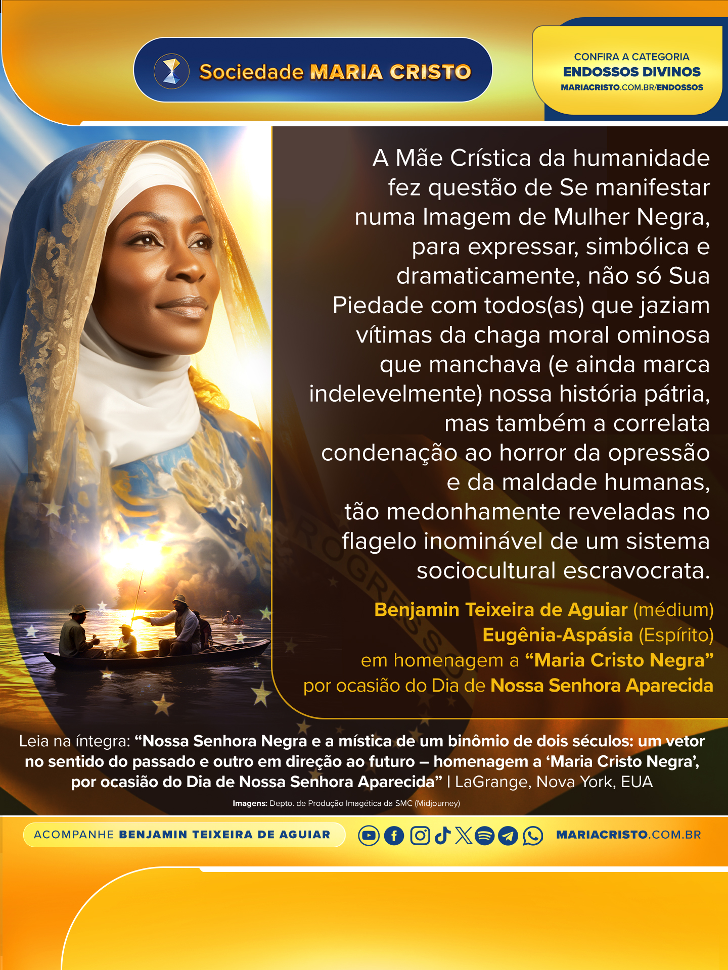 A Mãe Crística da humanidade fez questão de Se manifestar numa Imagem de Mulher Negra, para expressar, simbólica e dramaticamente, não só Sua Piedade com todos(as) que jaziam vítimas da chaga moral ominosa que manchava (e ainda marca indelevelmente) nossa história pátria, mas também a correlata condenação ao horror da opressão e da maldade humanas, tão medonhamente reveladas no flagelo inominável de um sistema sociocultural escravocrata.