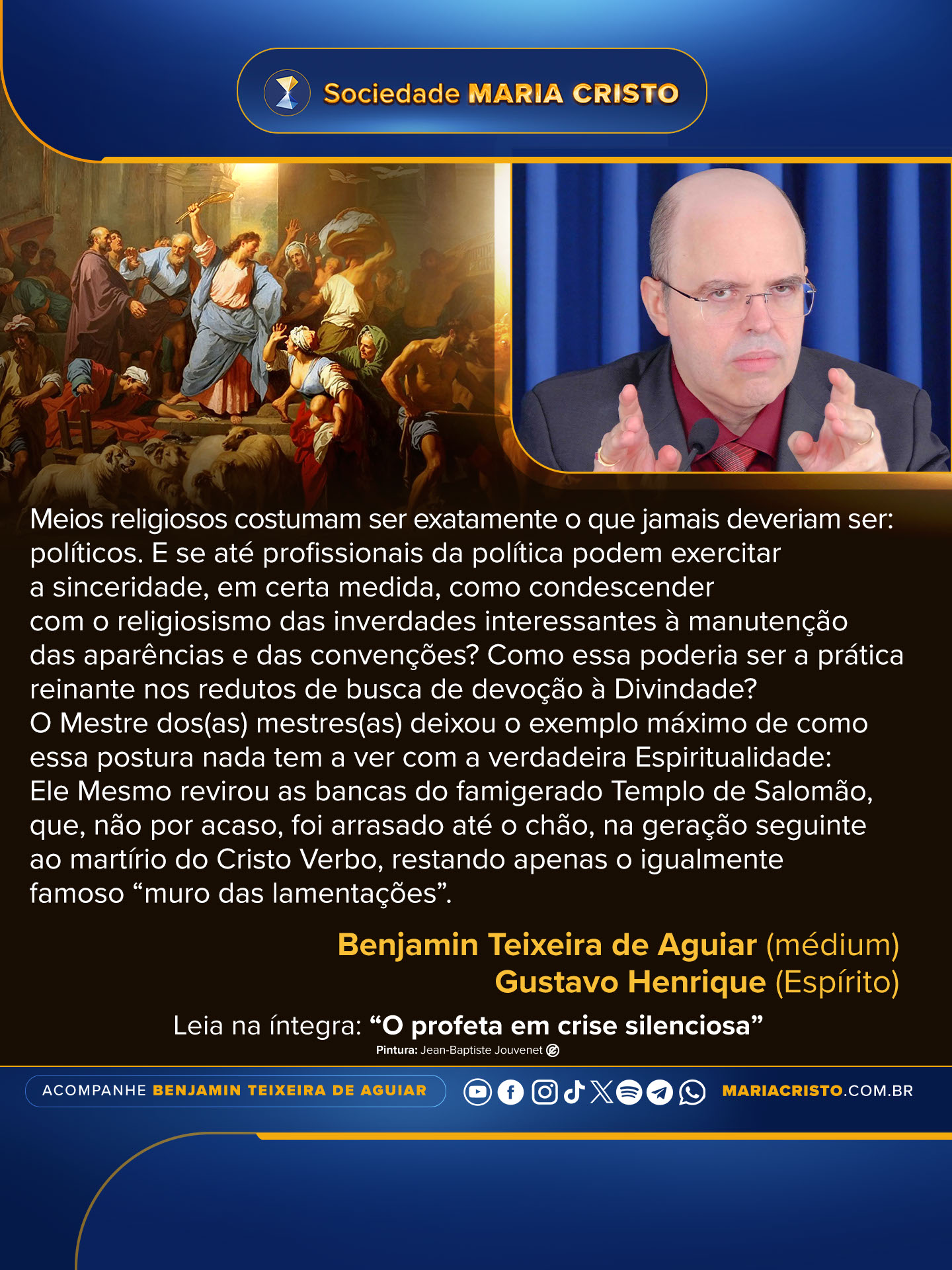 Meios religiosos costumam ser exatamente o que jamais deveriam ser: políticos. E se até profissionais da política podem exercitar a sinceridade, em certa medida, como condescender com o religiosismo das inverdades interessantes à manutenção das aparências e convenções sociais? Como essa poderia ser a prática reinante nos redutos de busca de devoção à Divindade? O Mestre dos(as) mestres(as) deixou o exemplo máximo de como essa postura nada tem a ver com a verdadeira Espiritualidade: Ele Mesmo revirou as bancas do famigerado Templo de Salomão, que, não por acaso, foi arrasado até o chão, na geração seguinte ao martírio do Cristo Verbo, restando apenas o igualmente famoso “muro das lamentações”.