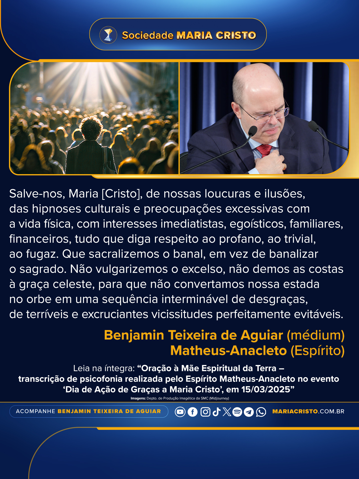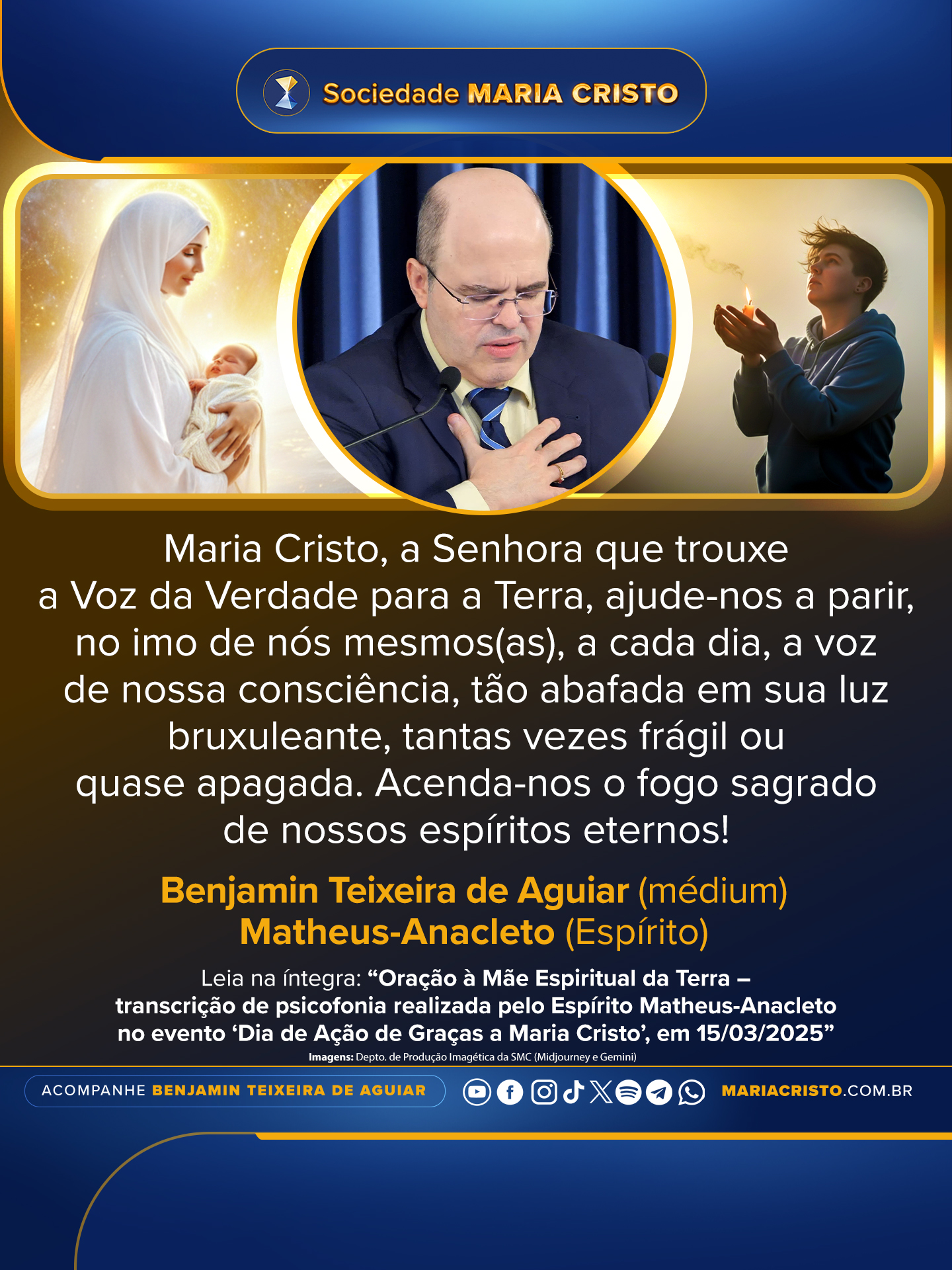 Maria Cristo, a Senhora que trouxe a Voz da Verdade para a Terra, ajude-nos a parir, no imo de nós mesmos(as), a cada dia, a voz de nossa consciência, tão abafada em sua luz bruxuleante, tantas vezes frágil ou quase apagada. Acenda-nos o fogo sagrado de nossos espíritos eternos!