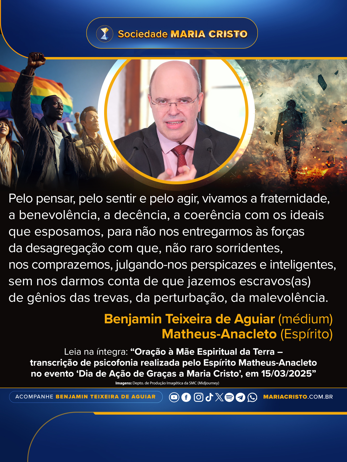 Nada disso é utopia. Uma distopia, sim, estaremos paulatinamente engendrando em nossos destinos, sempre que ignorarmos a voz da consciência e denegarmos a máxima crística basilar: “Buscai primeiramente o Reino de Deus e Sua Justiça, e o demais se vos acrescentarᔲ. Incautos(as) que escolhem o mundo e suas injustiças acabam perdendo tudo, cedo ou tarde, inclusive aquilo que imaginavam preservar.