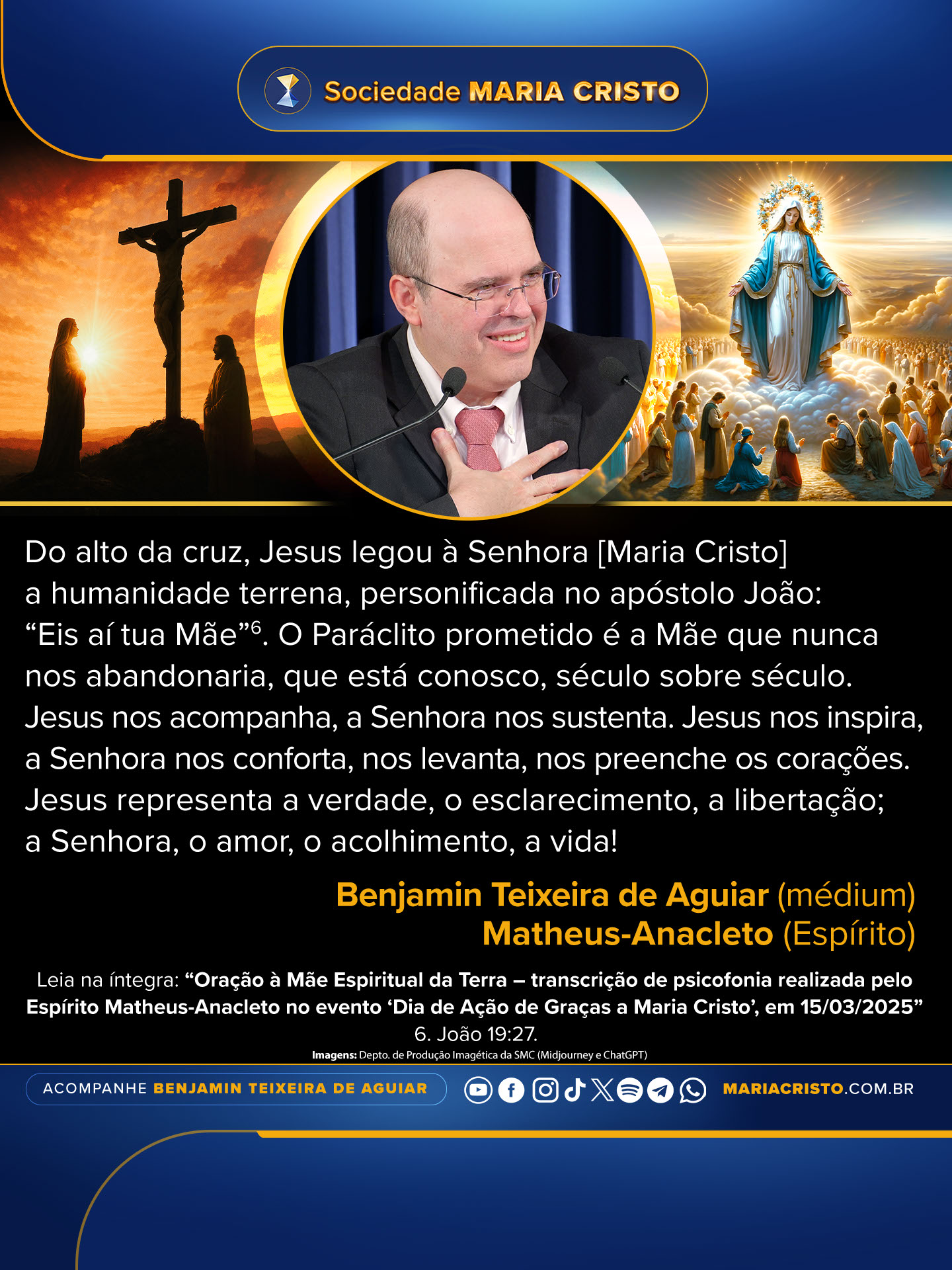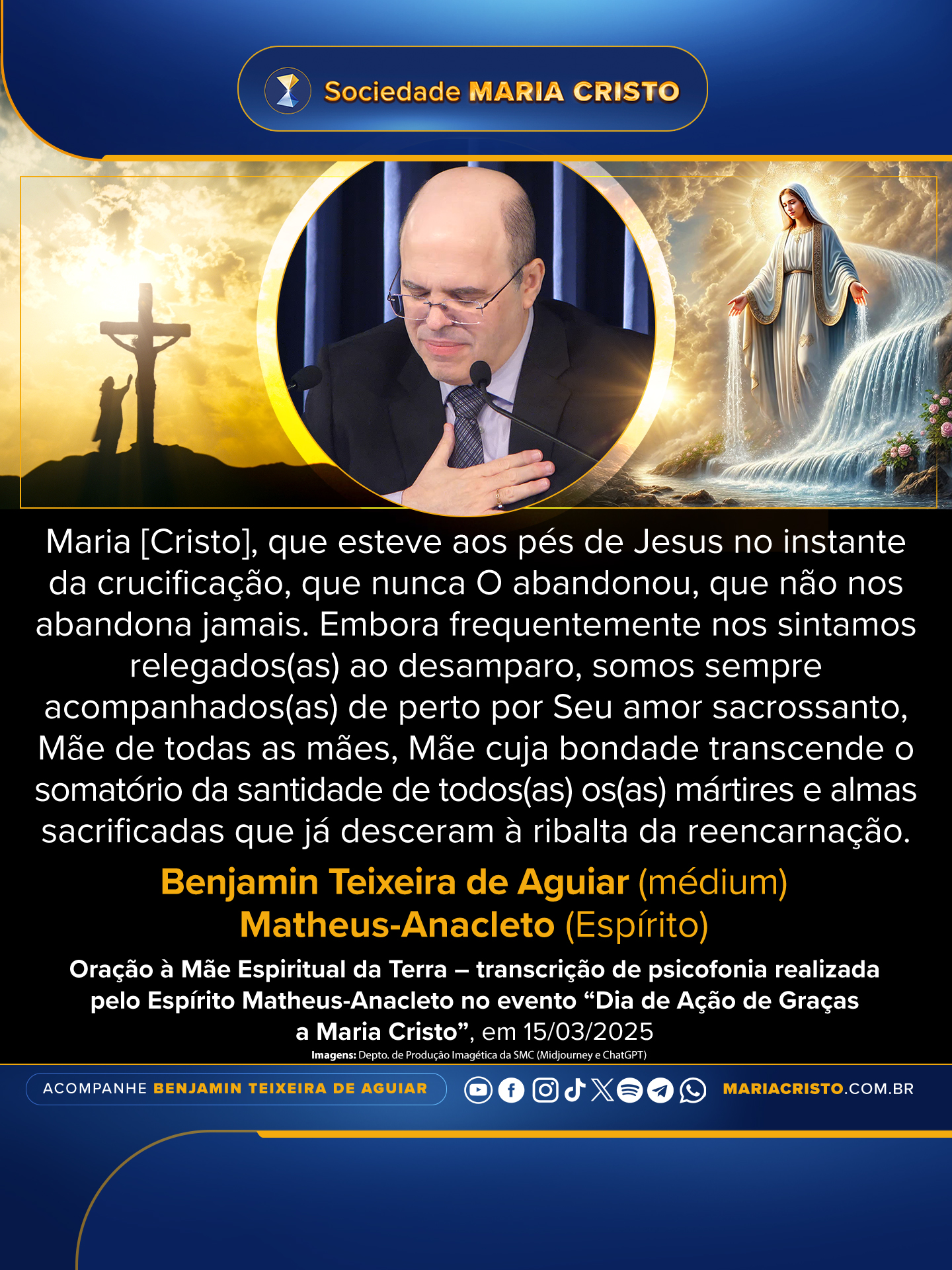 Maria, que esteve aos pés de Jesus no instante da crucificação, que nunca O abandonou, que não nos abandona jamais. Embora frequentemente nos sintamos relegados(as) ao desamparo, somos sempre acompanhados(as) de perto por Seu amor sacrossanto, Mãe de todas as mães, Mãe cuja bondade transcende o somatório da santidade de todos(as) os(as) mártires e almas sacrificadas que já desceram à ribalta da reencarnação.