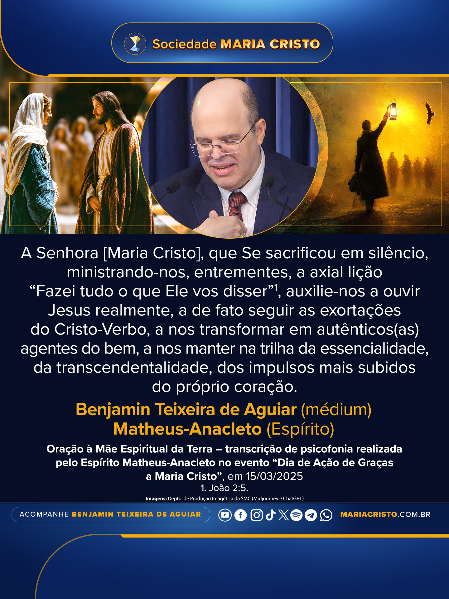 A Senhora, que Se sacrificou em silêncio, ministrando-nos, entrementes, a axial lição “Fazei tudo o que Ele vos disser”¹, auxilie-nos a ouvir Jesus realmente, a de fato seguir as exortações do Cristo-Verbo, a nos transformar em autênticos(as) agentes do bem, a nos manter na trilha da essencialidade, da transcendentalidade, dos impulsos mais subidos do próprio coração.