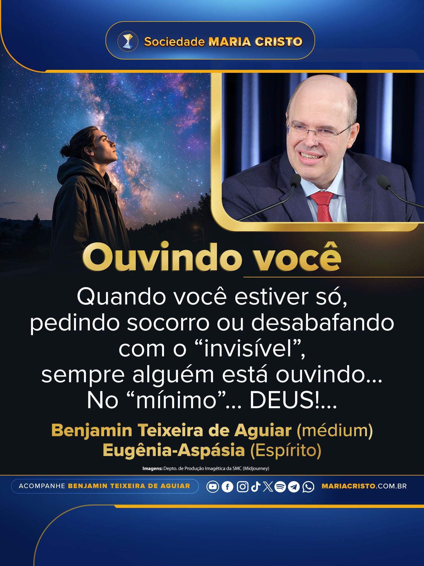 Ouvindo você.14 de outubro de 2015 | Espírito Eugênia-Aspásia, Mensagens sumárias Máximas do Espírito Eugênia-AspásiaQuando você estiver só, pedindo socorro ou desabafando com o “invisível”, sempre alguém está ouvindo… No “mínimo”… DEUS!…Espírito Eugênia-Aspásia. Médium: Benjamin Teixeira de Aguiar. 22 de setembro de 2015.