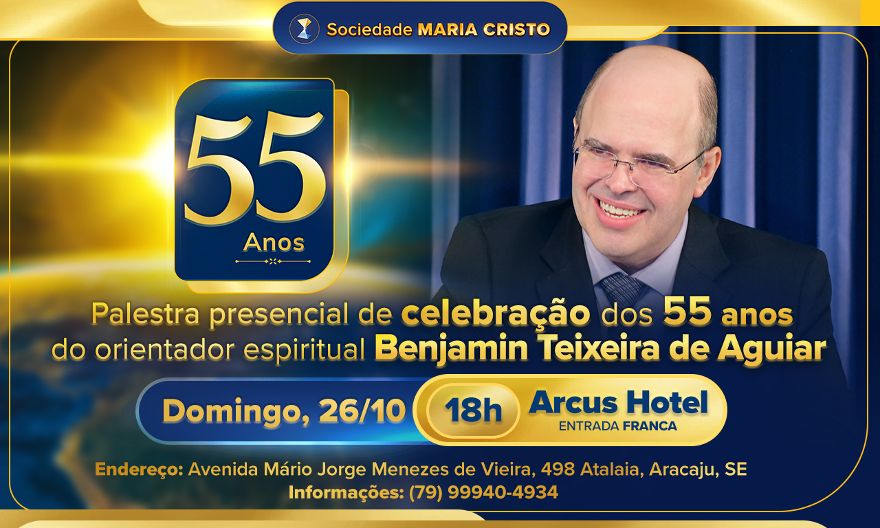 PALESTRA ESPECIAL de CELEBRAÇÃO! Neste domingo, 26, a palestra presencial do orientador espiritual Benjamin Teixeira de Aguiar acontecerá em clima de festa para seus(suas) alunos(as) e admiradores(as). É que o ilustre sergipano aniversaria 55 anos exatamente no dia 26 de outubro. Como é de domínio comum, Benjamin não se agrada muito de homenagens públicas, tanto que, desde o início da década passada, suas equipes foram terminantemente proibidas de tomar qualquer tipo de iniciativa nesse sentido. Todavia, dada a coincidência com a data da preleção domingueira, alguns(umas) colaboradores(as) mais próximos acabaram por receber autorização para exibirem, na noite de celebração, um vídeo histórico com breve retrospectiva de sua brilhante trajetória como conferencista. A produção audiovisual pincela momentos especiais do discurso vanguardista e libertador que ele e seu guia, o Espírito Eugênia-Aspásia, propalam como porta-vozes da denominada “Espiritualidade Supraordenadora Benevolente”. O encontro comemorativo ocorrerá no Arcus Hotel, localizado na Avenida Mário Jorge Menezes de Vieira, 498, bairro Atalaia, Aracaju. A entrada é sempre franca! Parabéns e felicidades ao consagrado professor de “vida em abundância”!