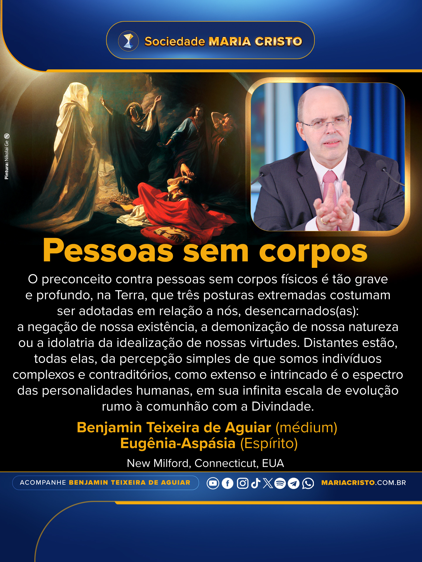 O preconceito contra pessoas sem corpos físicos é tão grave e profundo, na Terra, que três posturas extremadas costumam ser adotadas em relação a nós, desencarnados: a negação de nossa existência, a demonização de nossa natureza ou a idolatria da idealização de nossas virtudes. Distantes estão, todas elas, da percepção simples de que somos indivíduos complexos e contraditórios, como extenso e intrincado é o espectro das personalidades humanas, em sua infinita escala de evolução rumo à comunhão com a Divindade.