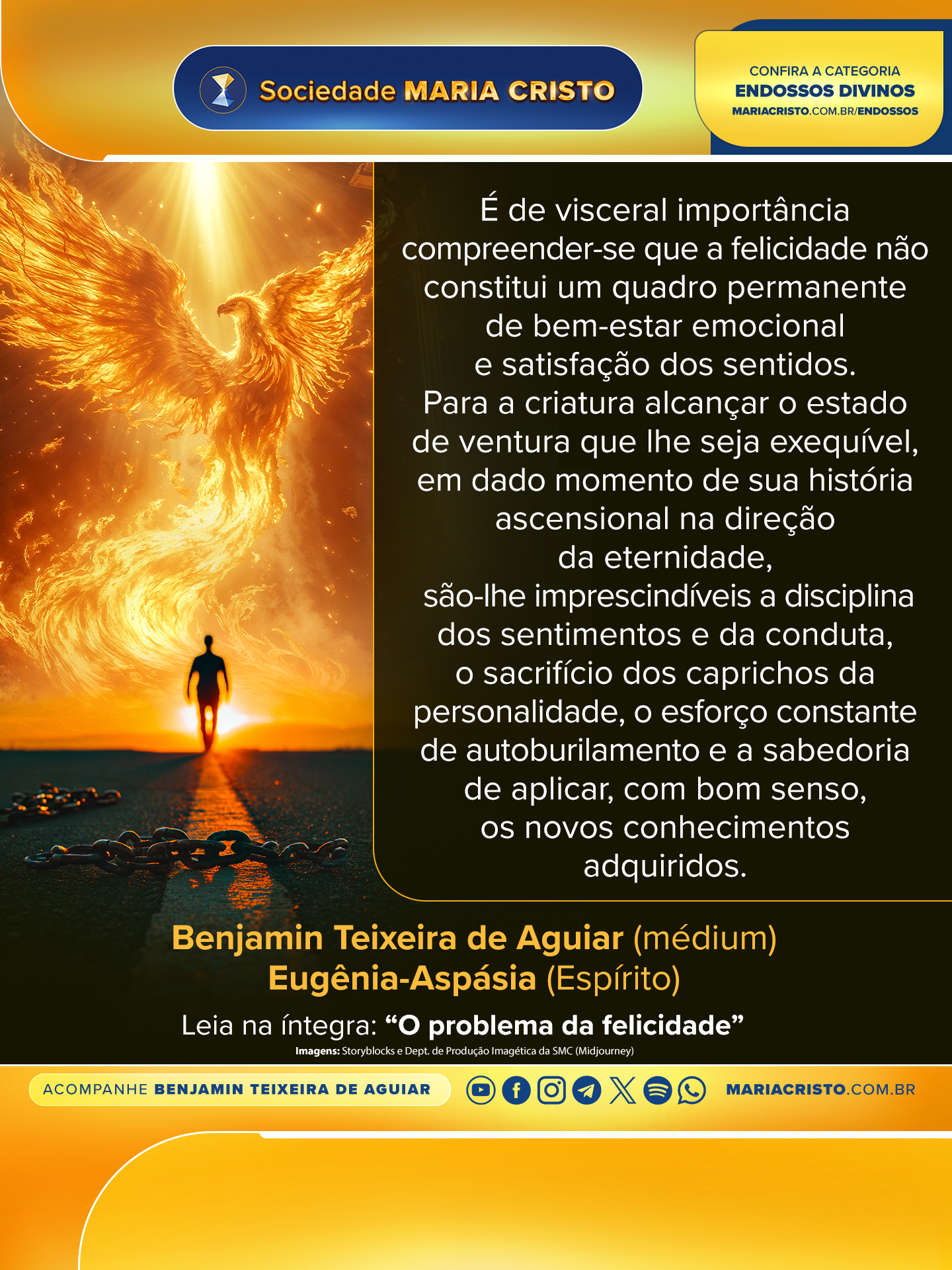 Para a criatura alcançar o estado de felicidade que lhe seja exequível, em dado momento de sua história ascensional em direção à eternidade, são-lhe imprescindíveis a disciplina dos sentimentos e da conduta, o sacrifício dos caprichos da personalidade, o esforço constante de autoburilamento e a sabedoria de aplicar, com bom senso, os novos conhecimentos adquiridos, seja por experiência própria ou pelo aprendizado que possa extrair de vivências partilhadas por terceiros, não importando se mais ou menos adiantados na espiral evolutiva do espírito.