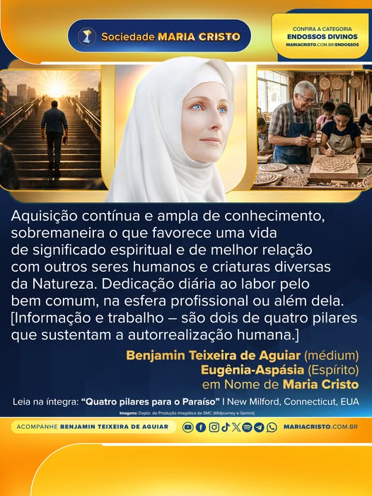 Esses são, para espíritos encapsulados ou não em corpos de matéria densa, os quatro pilares que, assentados no piso fundamental ou espiritual da realidade, sustentam a plataforma basilar da autorrealização humana, propiciando ao(à) buscador(a) da Luz, de acordo com as possibilidades de percepção intelectual e elaboração emocional de cada qual, o que se pode compreender como Paraíso ou, nas palavras de Jesus, “Reino dos Céus”.