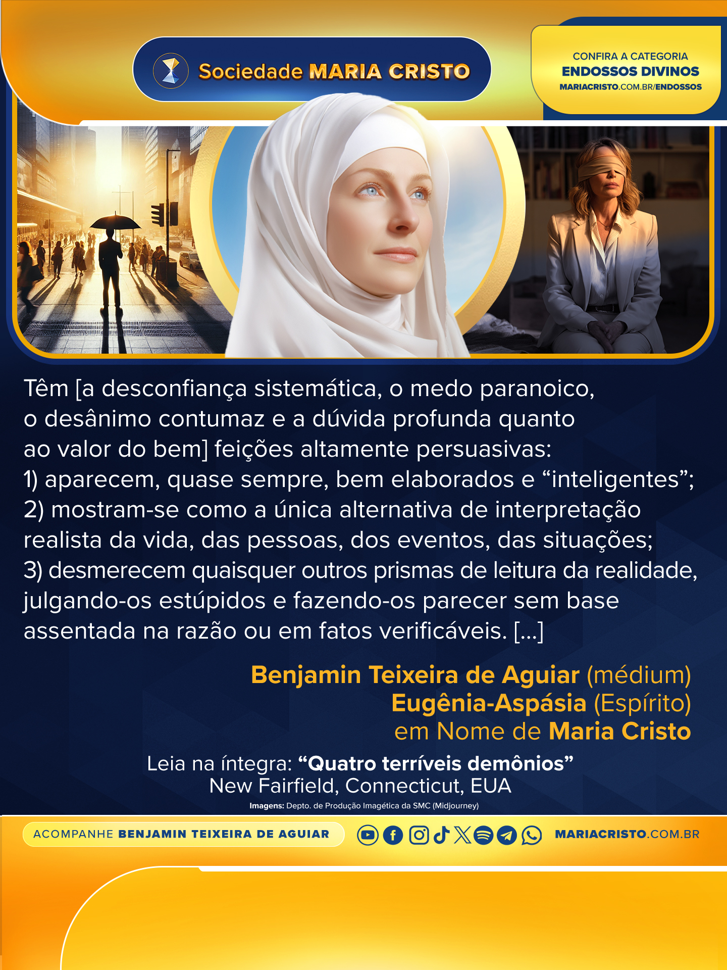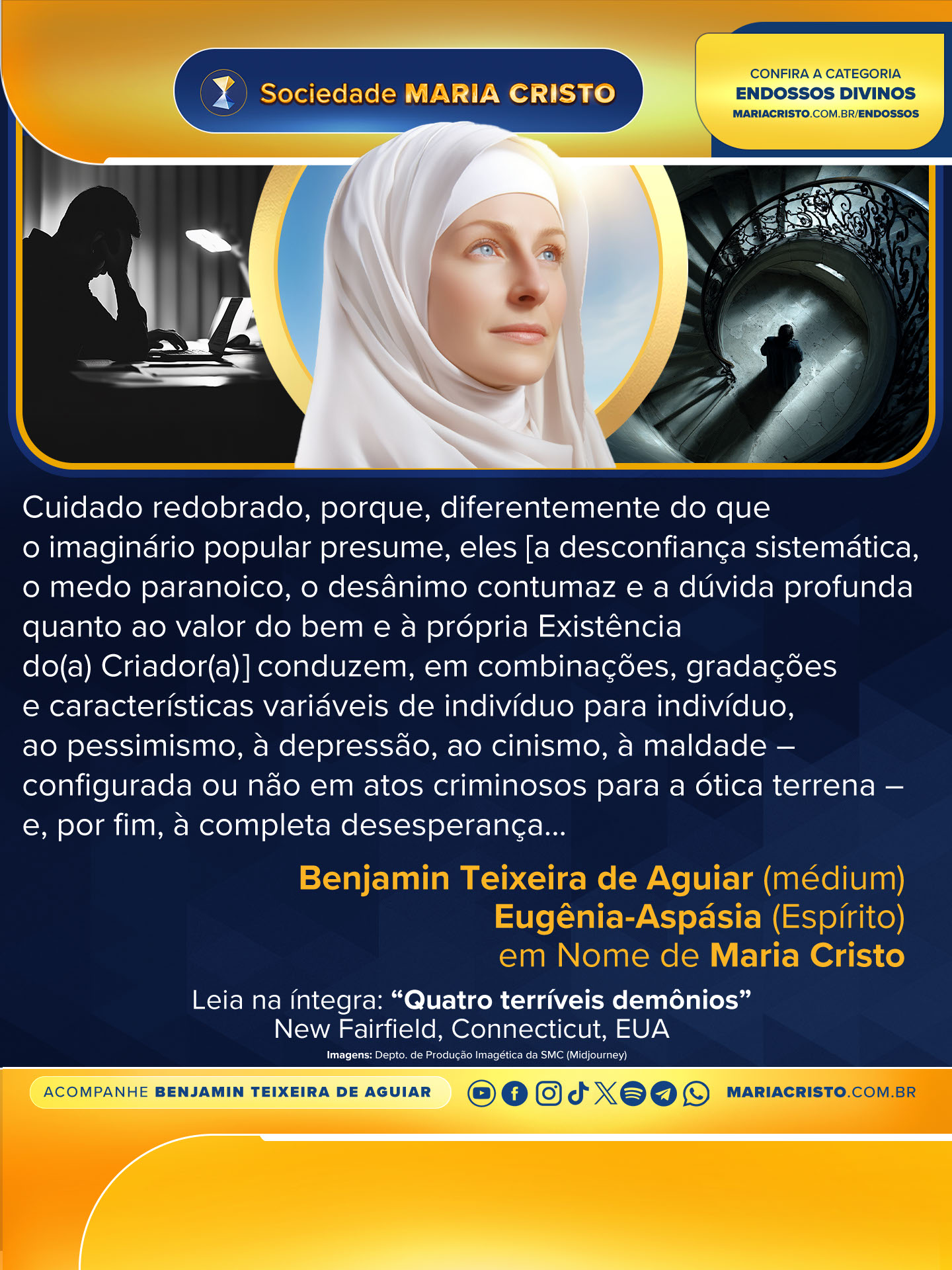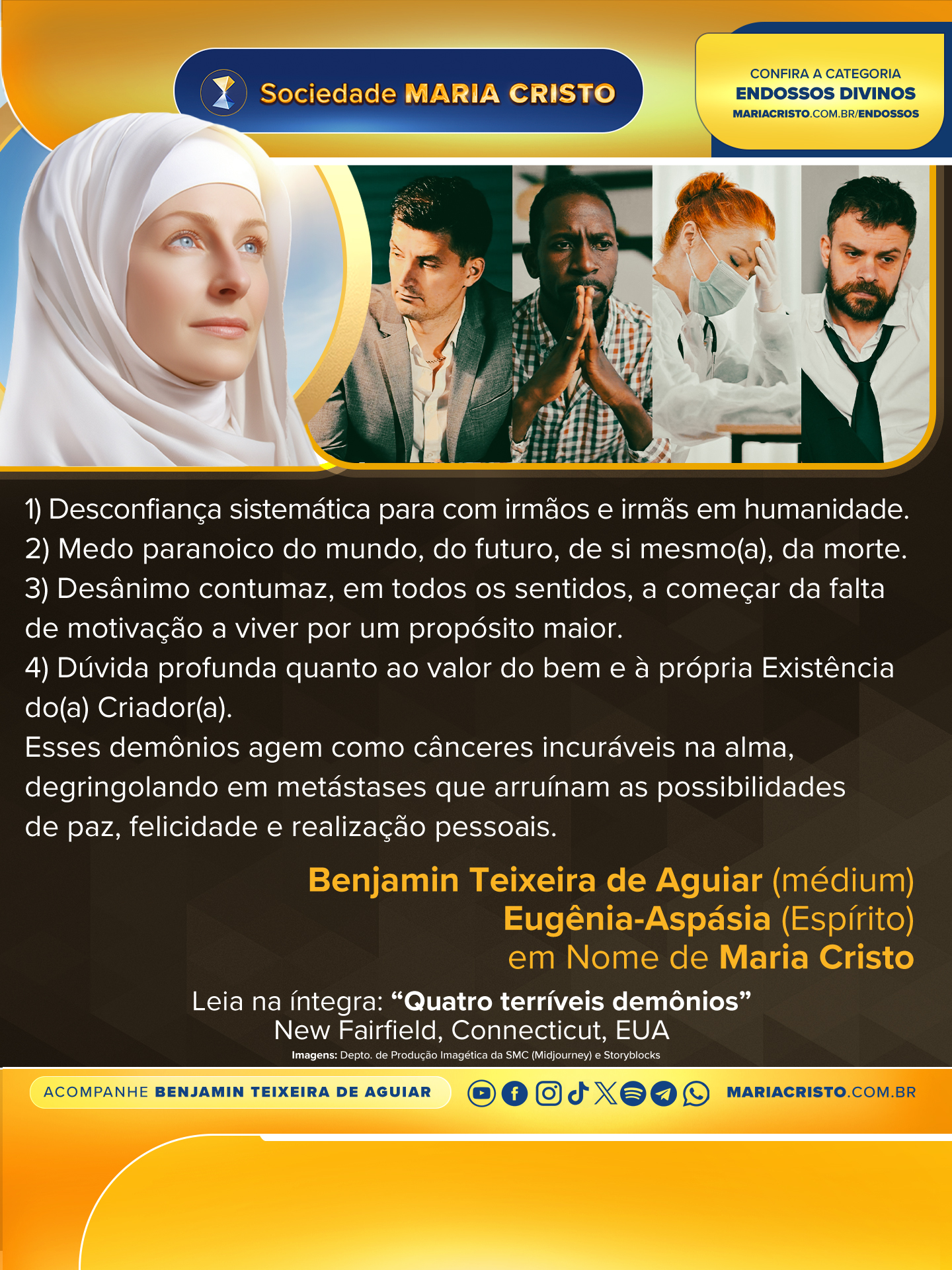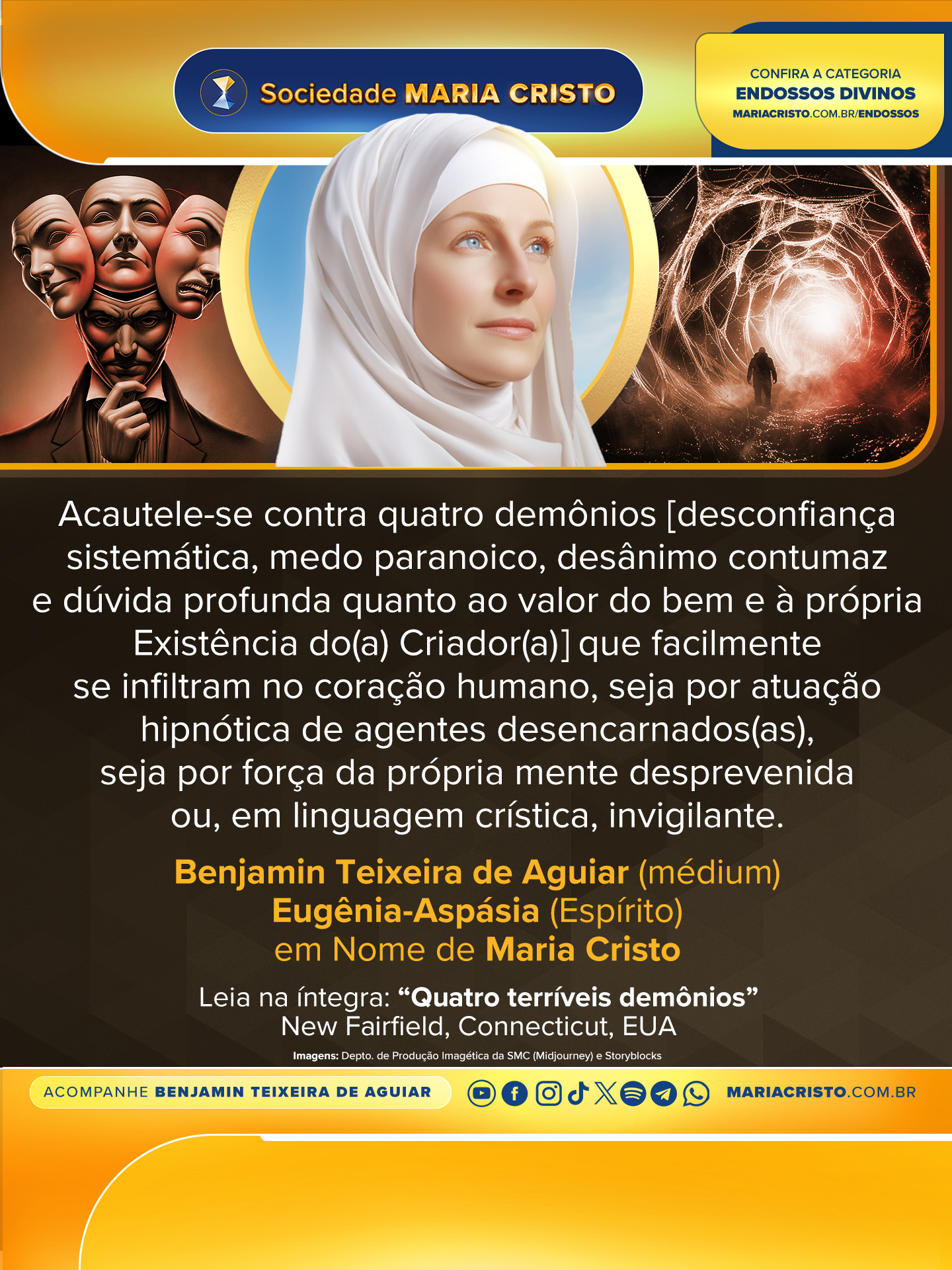 Acautele-se contra quatro demônios que facilmente se infiltram no coração humano, seja por atuação hipnótica de agentes desencarnados(as), seja por força da própria mente desprevenida ou, em linguagem crística, invigilante:
