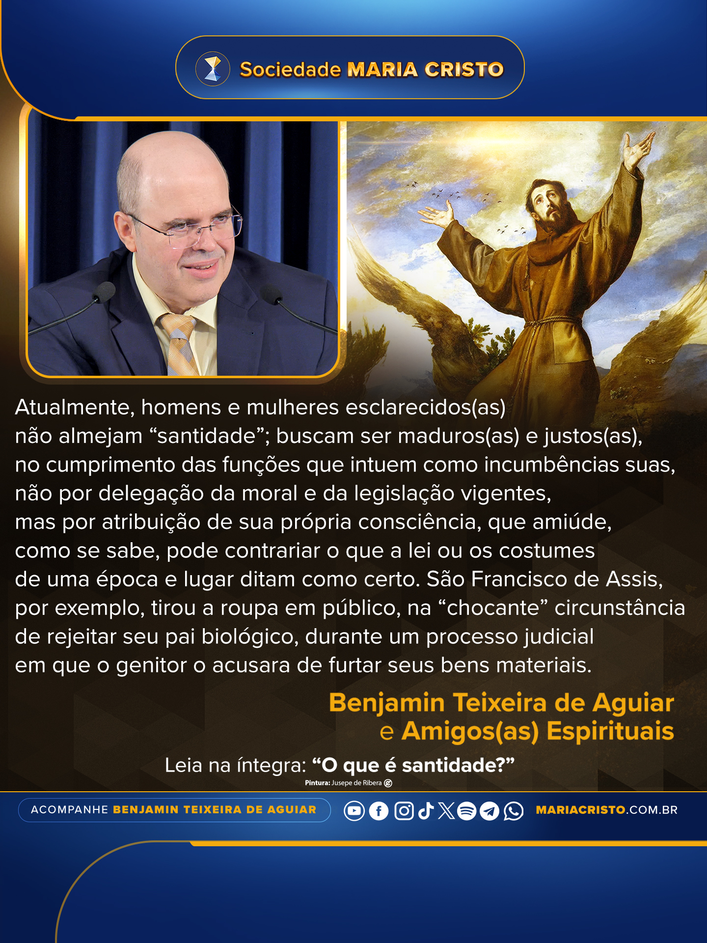 Atualmente, homens e mulheres esclarecidos não almejam “santidade”; buscam ser maduros e justos, no cumprimento das funções que intuem como incumbências suas, não por delegação da moral e da legislação vigentes, mas por atribuição de sua própria consciência, que amiúde, como se sabe, pode contrariar o que a lei ou os costumes de uma época e lugar ditam como certo.
