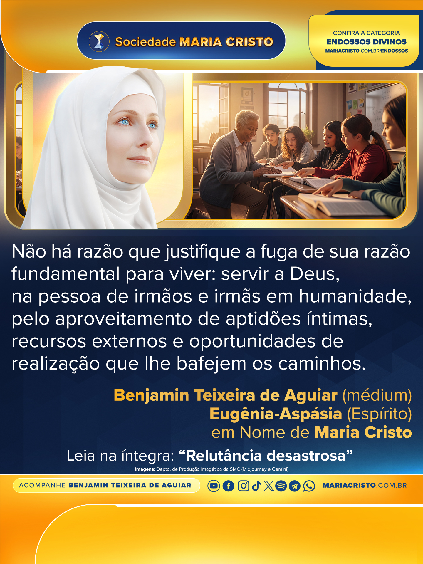 Não há razão que justifique a fuga de sua razão fundamental para viver: servir a Deus, na pessoa de irmãos e irmãs em humanidade, pelo aproveitamento de aptidões íntimas, recursos externos e oportunidades de realização que lhe bafejem os caminhos.