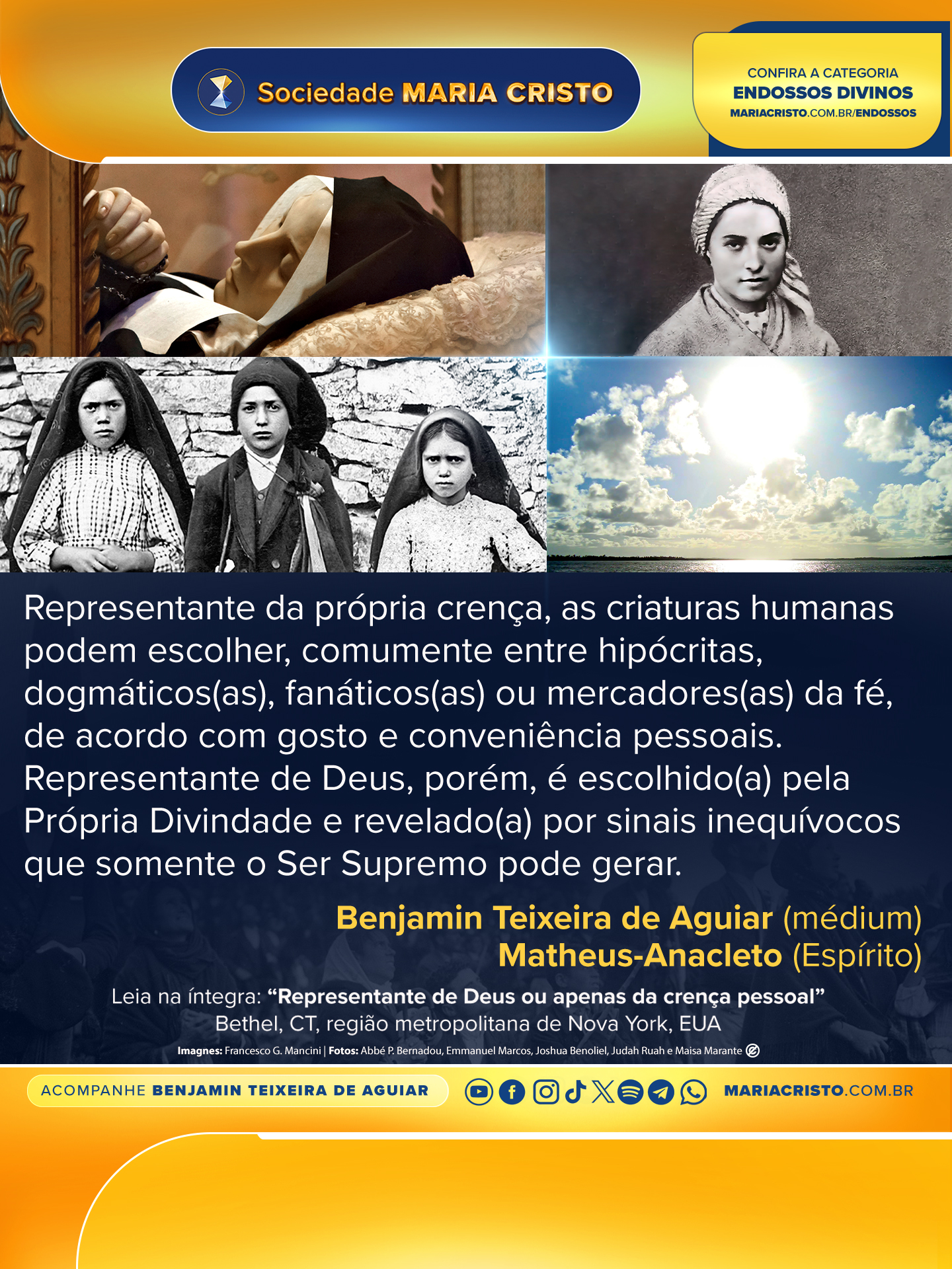 Representante de Deus, porém, é escolhido(a) pela Própria Divindade e revelado(a) por sinais inequívocos que somente o Ser Supremo pode gerar.
